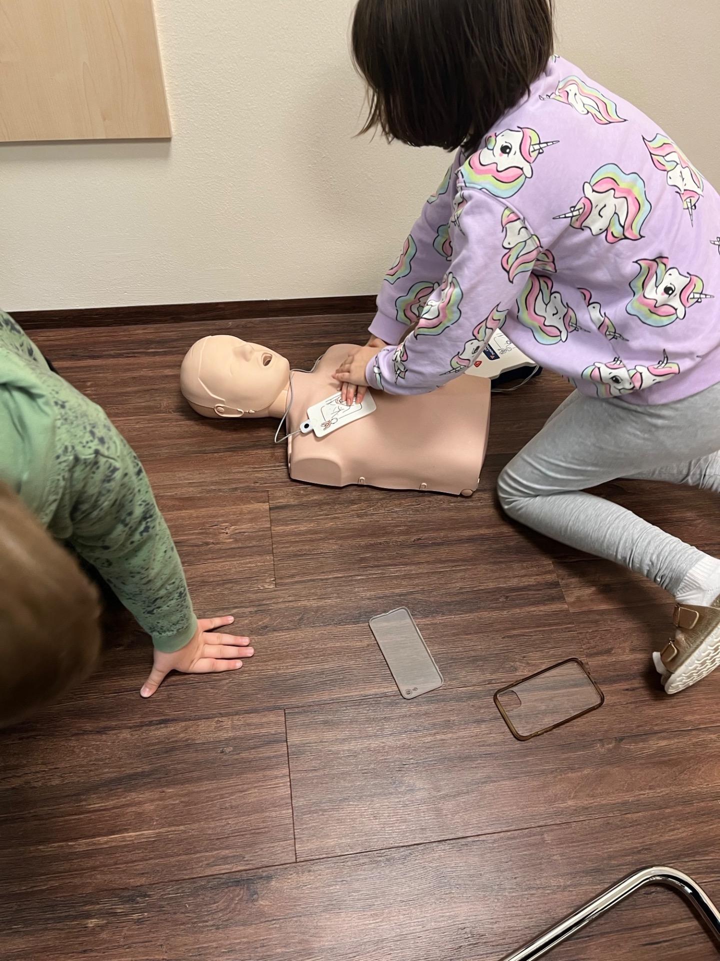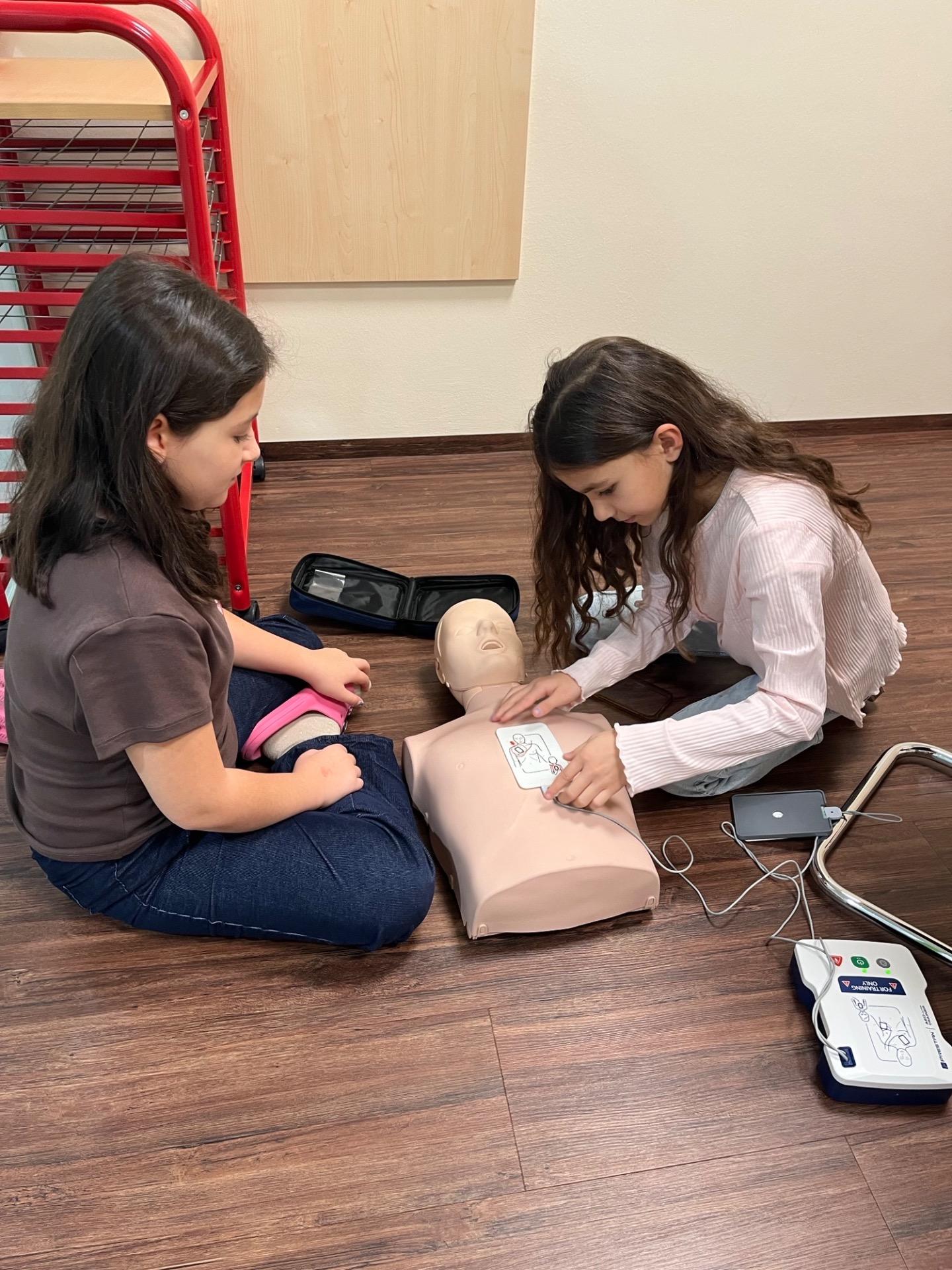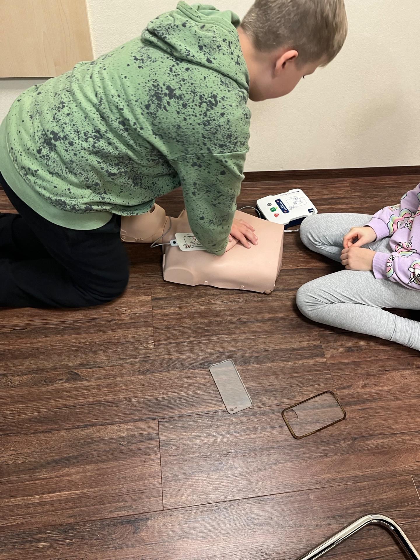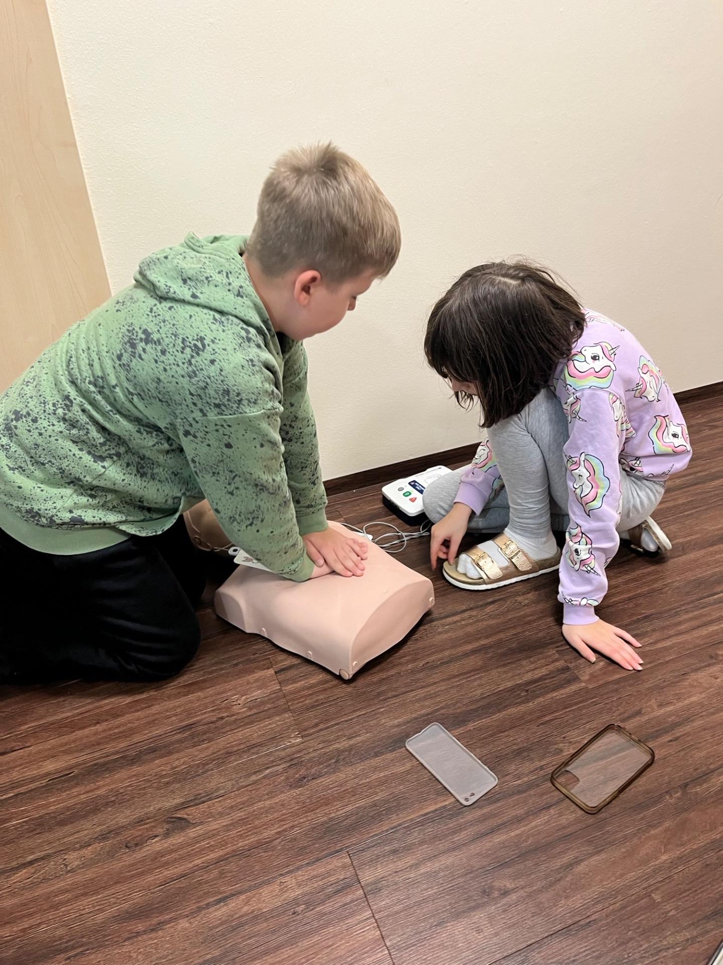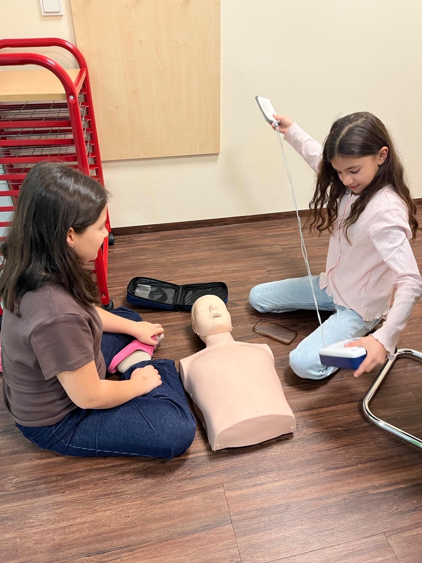 Im Rahmen des Projekts „Fit4Reanimation“ hat die vierte Klasse über mehrere Wochen hinweg gelernt, einen Notfall zu erkennen, einen Hilferuf abzusetzen, die Atmung zu kontrollieren, Thoraxkompressionen durchzuführen und sicher mit dem Defibrillator umzugehen. In Partnerarbeit konnten die Kinder ausführlich üben und dadurch viel Sicherheit gewinnen.