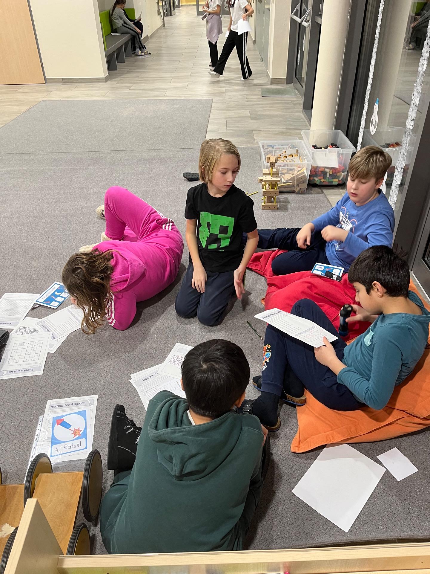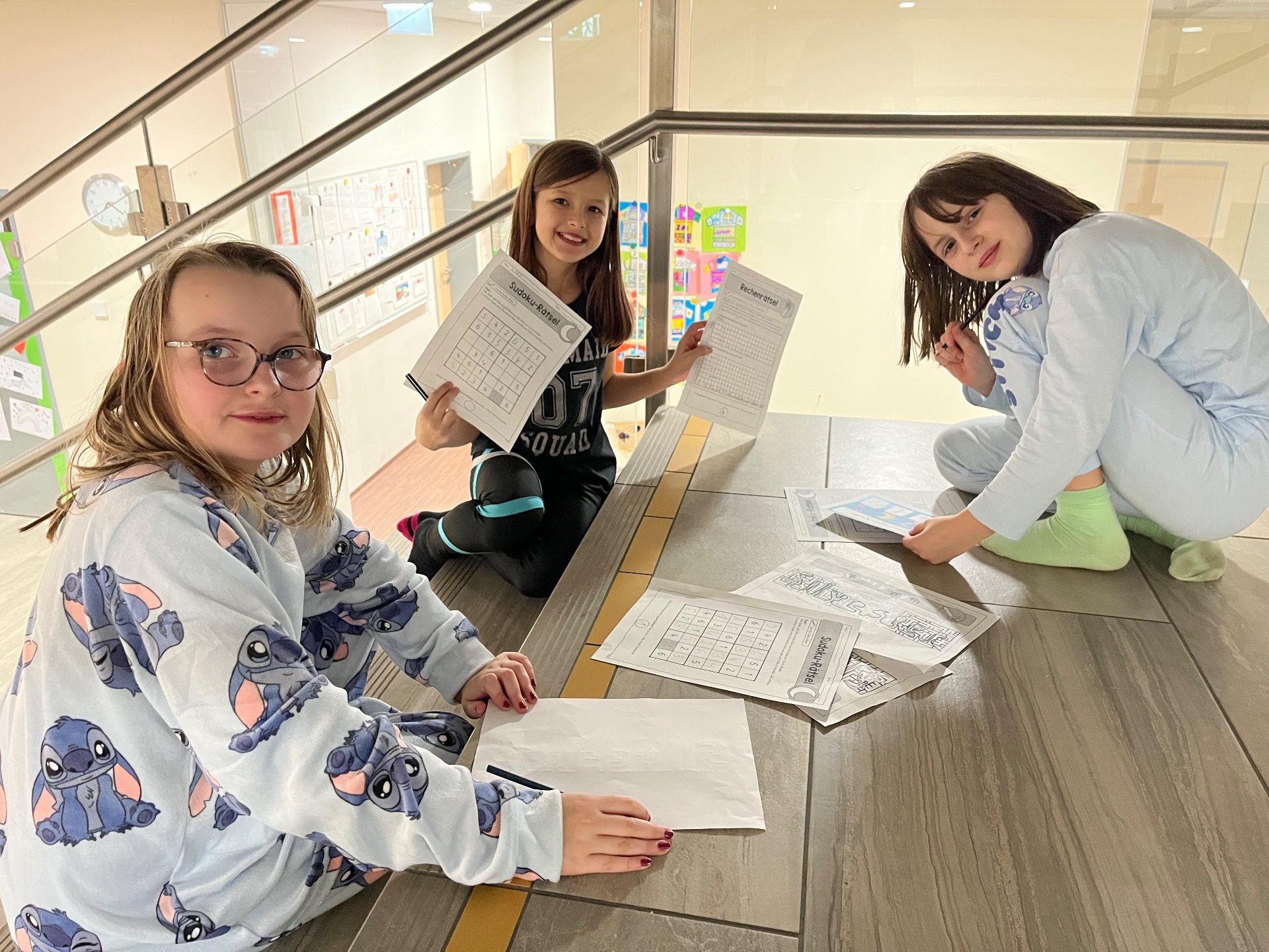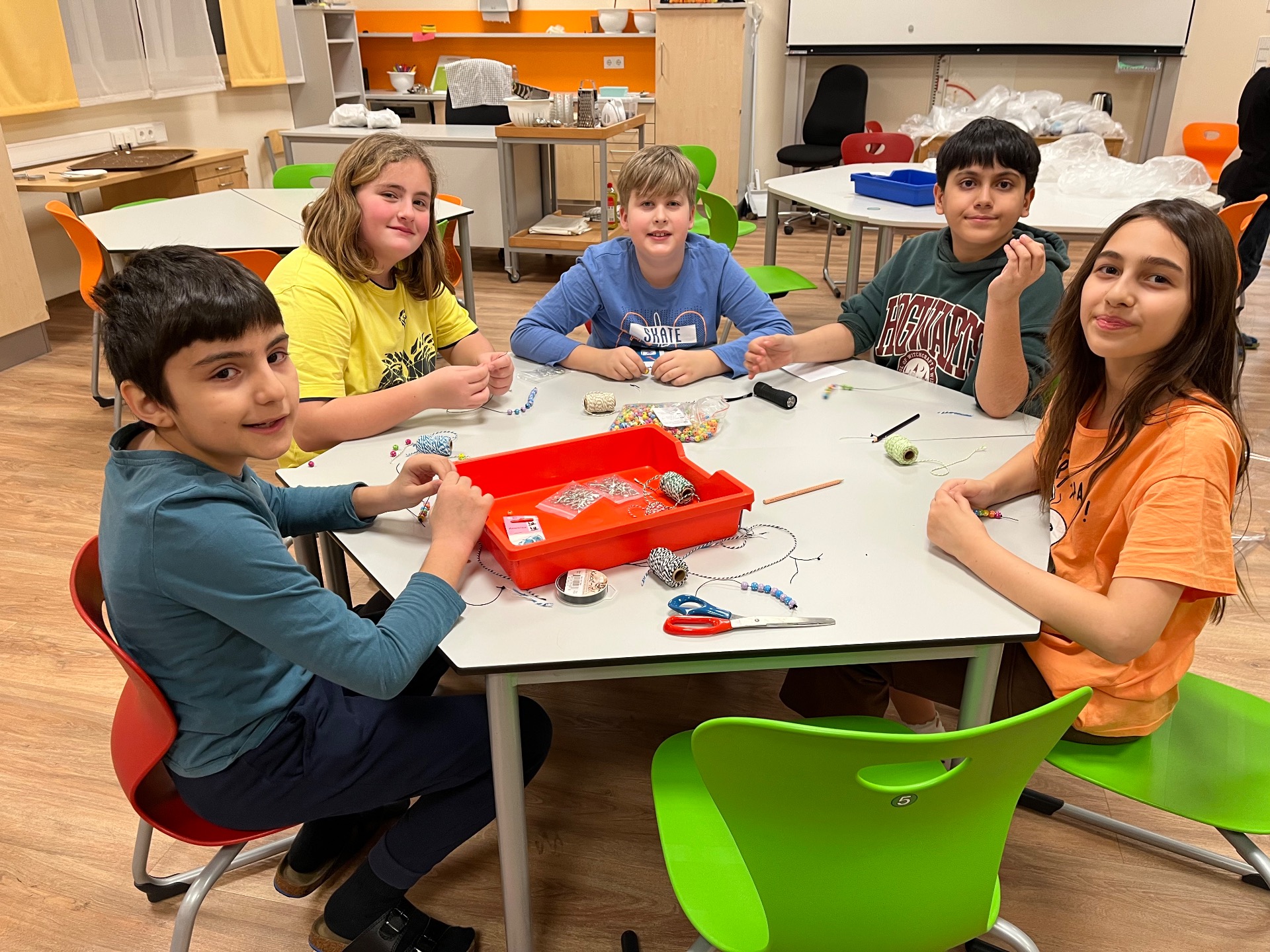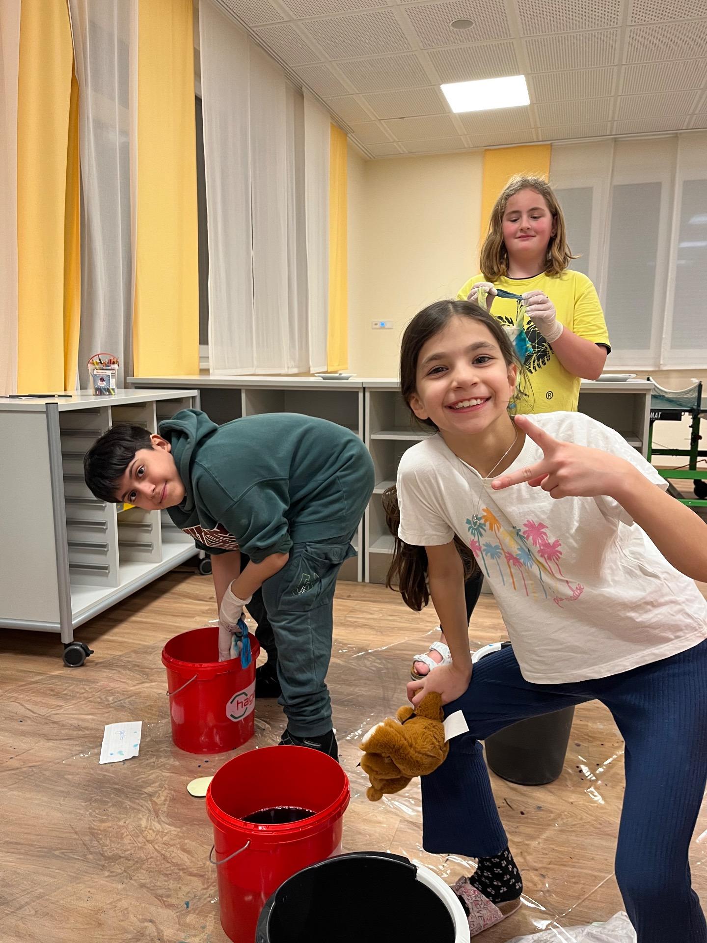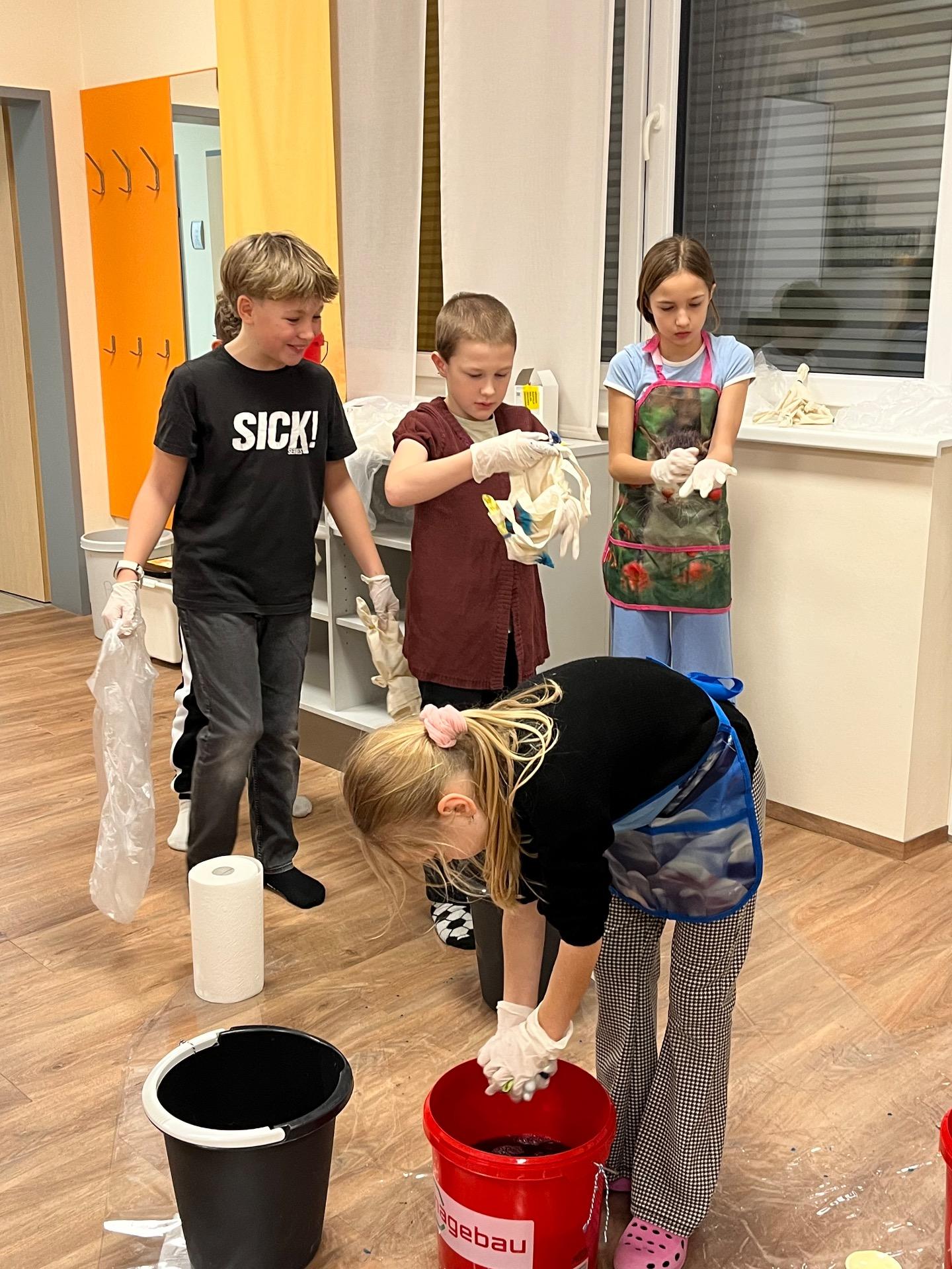 Außerdem gestalteten die Schülerinnen und Schüler Einkaufstaschen mit der Batiktechnik und bastelten dazu passende Perlenanhänger. Dabei entstanden viele farbenfrohe und ganz individuelle Stücke. Für besonders große Spannung sorgte ein Escape Room, bei dem die Kinder gemeinsam viele knifflige und interessante Rätsel lösen mussten.