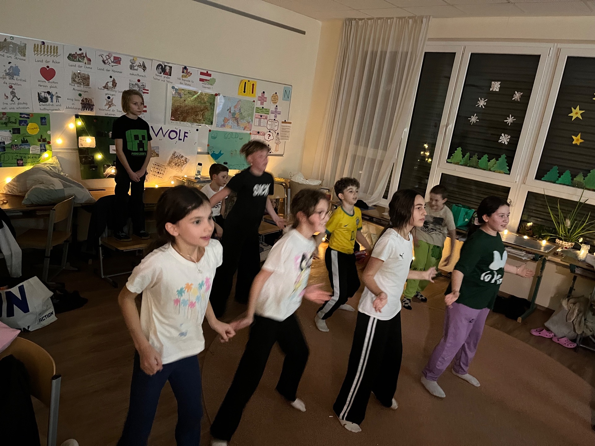 Das große Highlight des Abends war jedoch – wie so oft – das Versteckenspiel am Gang des Schulhauses. Dieses Spiel ist eindeutig das Lieblingsspiel der Kinder: Bei jeder Gelegenheit wird es begeistert eingefordert – und anschließend mit großer Freude gespielt.