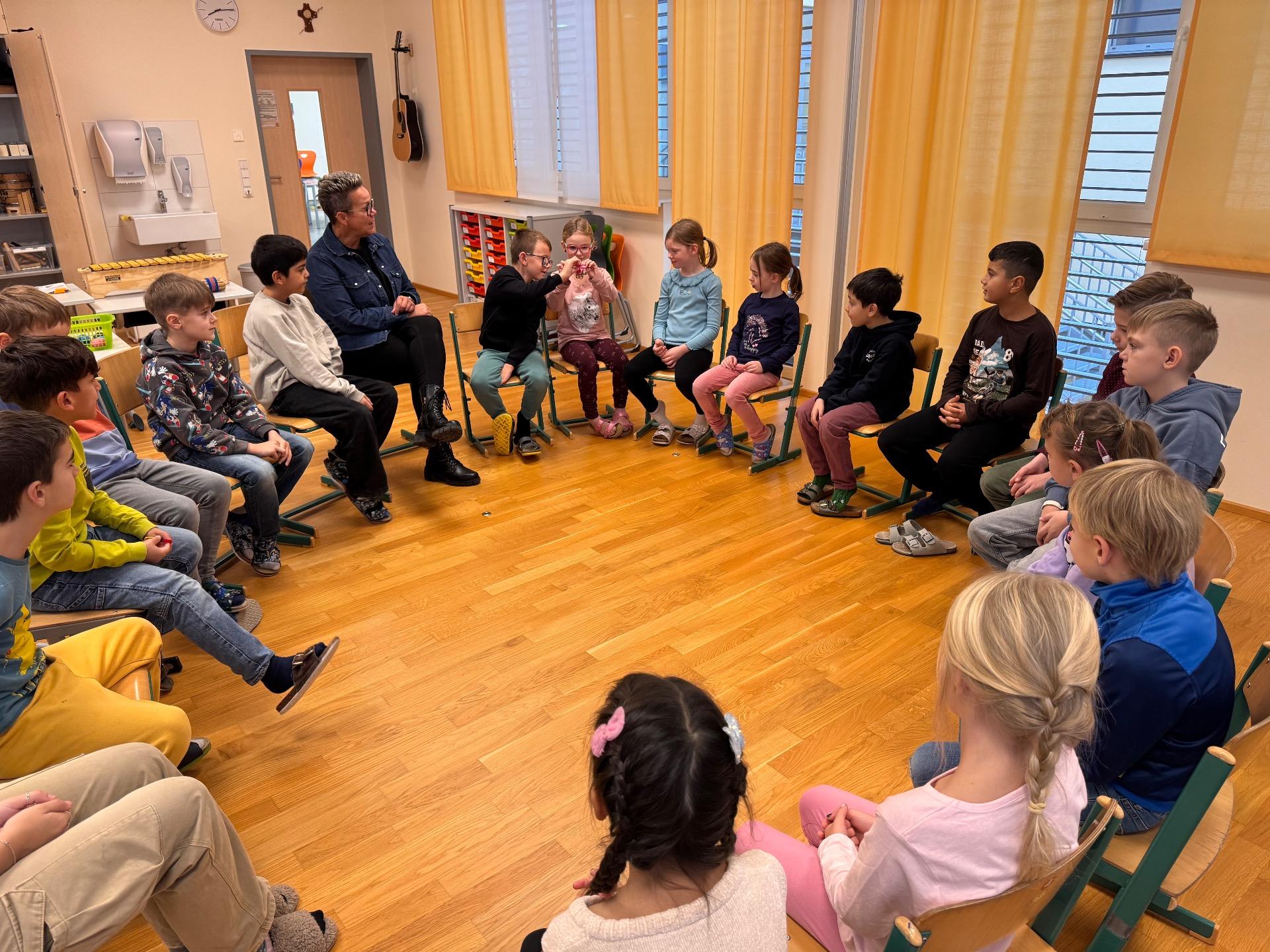 Zu Beginn stand eine Stilleübung auf dem Programm: Ein Rasselei wurde in der Runde weitergegeben – allerdings so leise, dass dabei kein Rasseln zu hören war. Diese Übung erforderte volle Konzentration und sorgte für gespannte Aufmerksamkeit im Klassenzimmer.