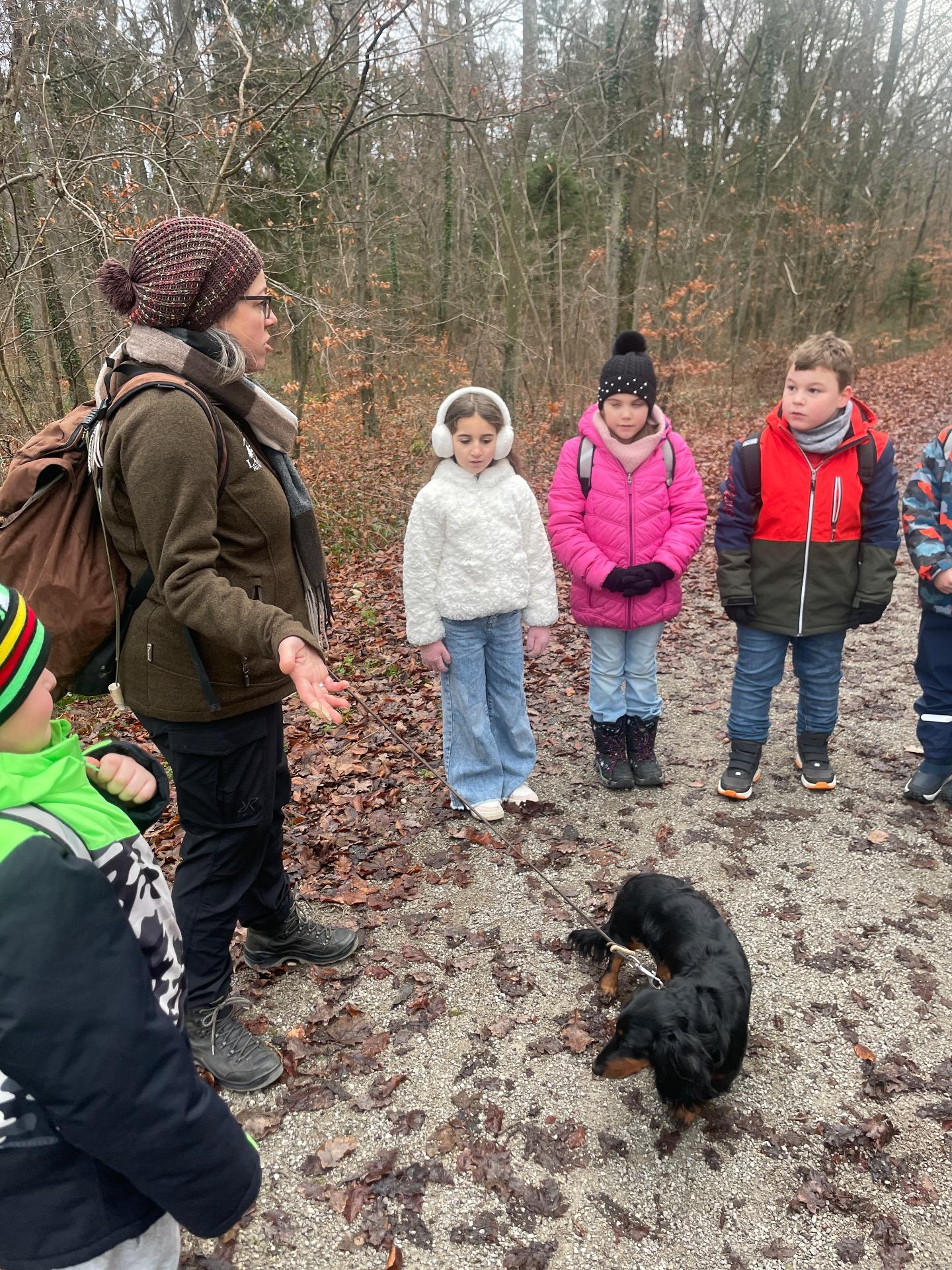 Eine besondere Freude war wieder der Hund der Waldpädagogin. Im Wald entdeckten wir erneut viele spannende Dinge. Wir fanden Spuren einer Eule und Schlafplätze von Rehen.