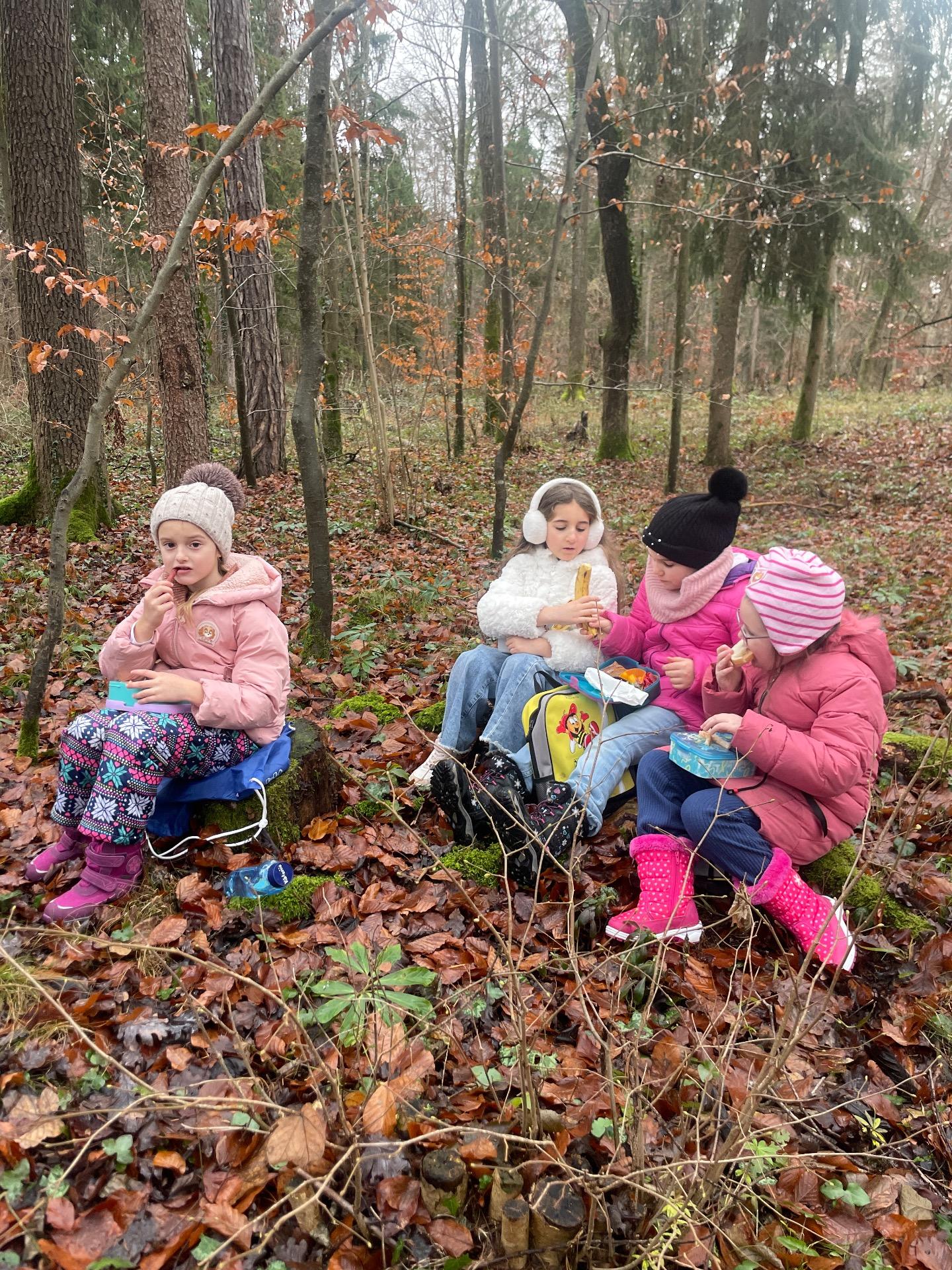 Zwischendurch stärkten wir uns bei einer gemütlichen Jause im Wald und spielten Bewegungsspiele wie „Jäger, Fuchs und Hase“, die für viel Freude und Bewegung sorgten. Außerdem beschäftigten wir uns mit den Unterschieden zwischen Nadelbäumen und Laubbäumen.