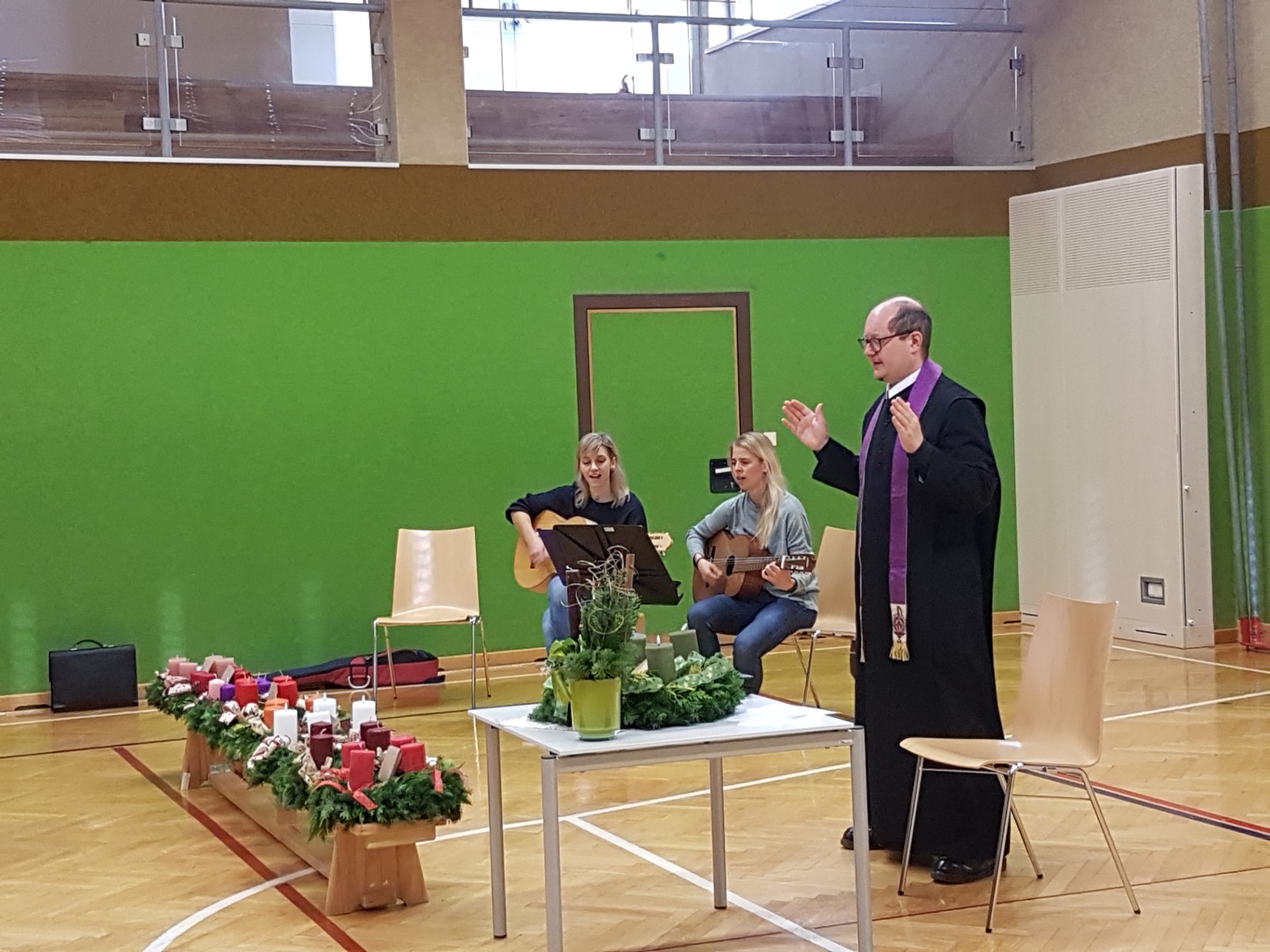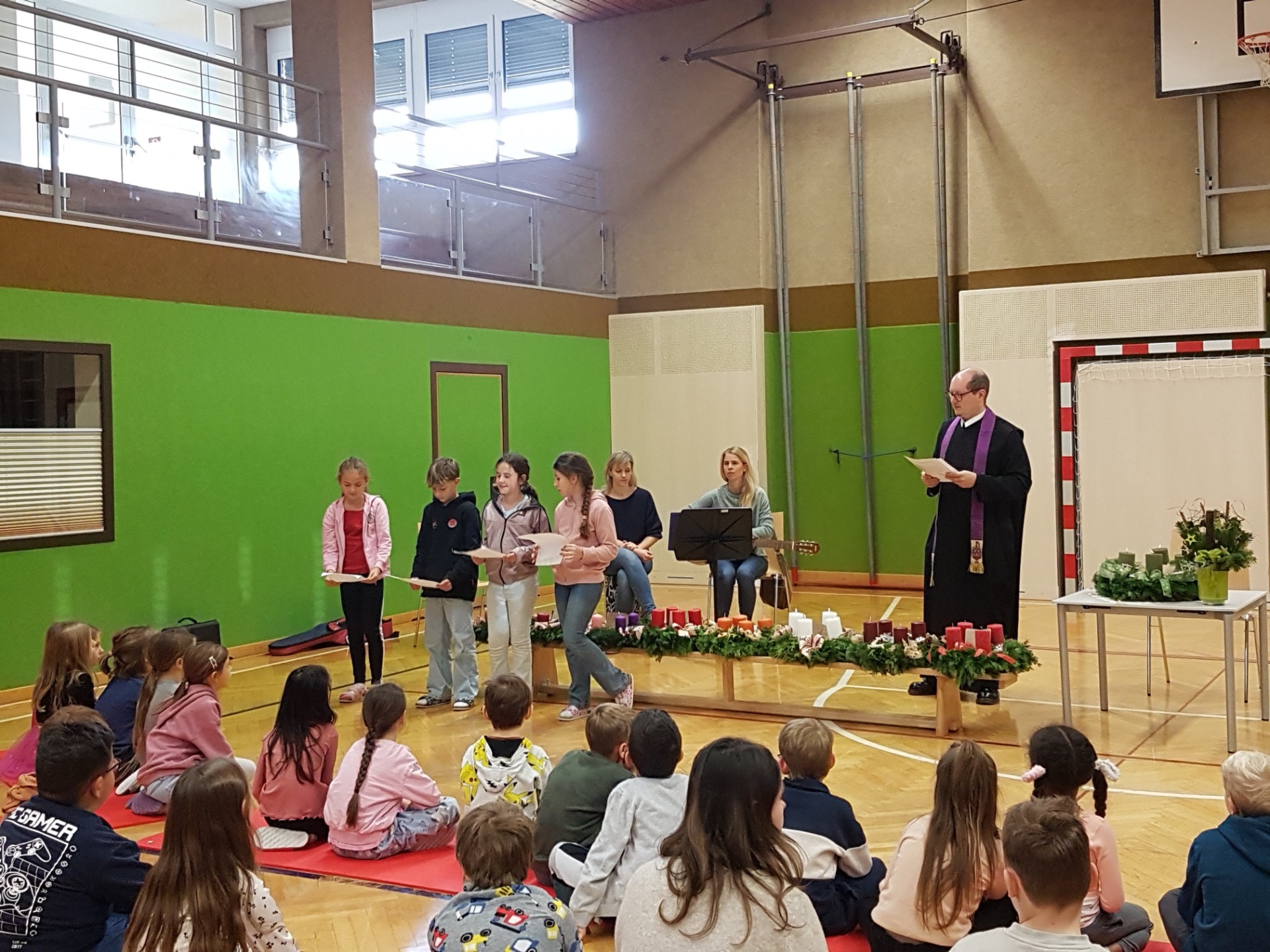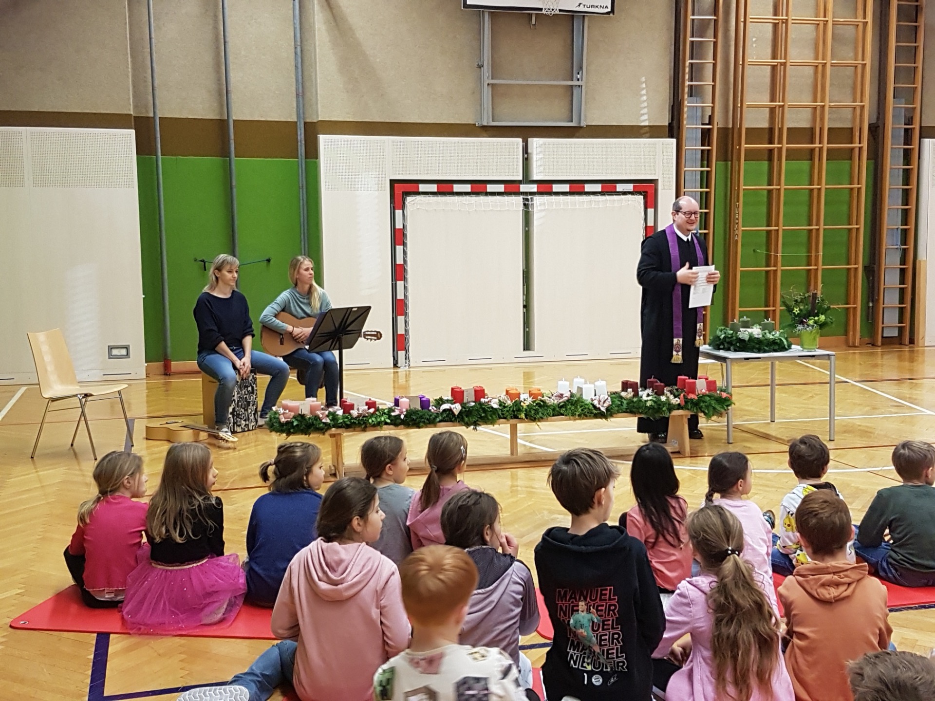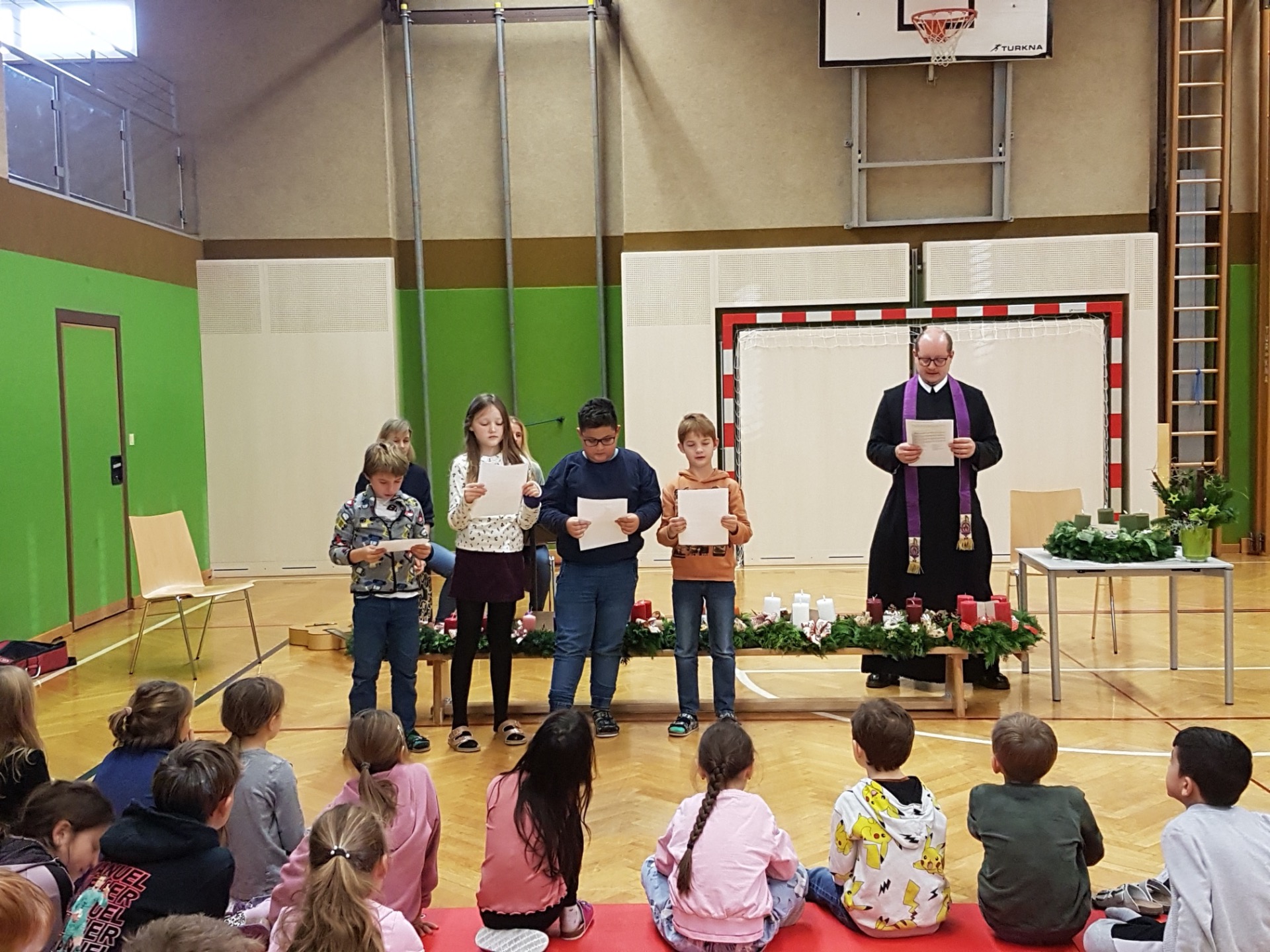 Am Freitag, den 28. November 2025, trafen sich alle Kinder unserer Schule zu einer feierlichen Adventkranzweihe im Turnsaal. Pater Vitus führte durch die besinnliche Feier und sprach den Segen über die Adventkränze, die der Elternverein für jede Klasse organisiert und finanziert hat. Ein herzliches Dankeschön an Birgit Wagner!
