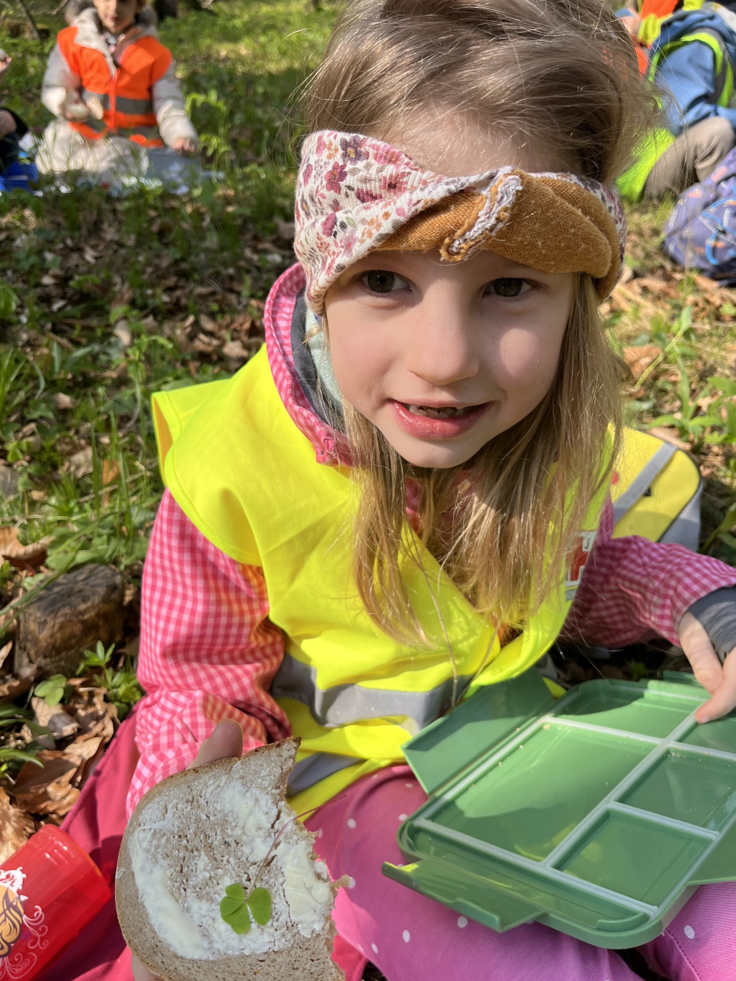 Vom Schlafzimmer aus ging es weiter in die Speisekammer. Der Waldklee auf dem Butterbrot, die frischen Blätter der Buche wie auch der Waldmeister schmeckten auch uns.