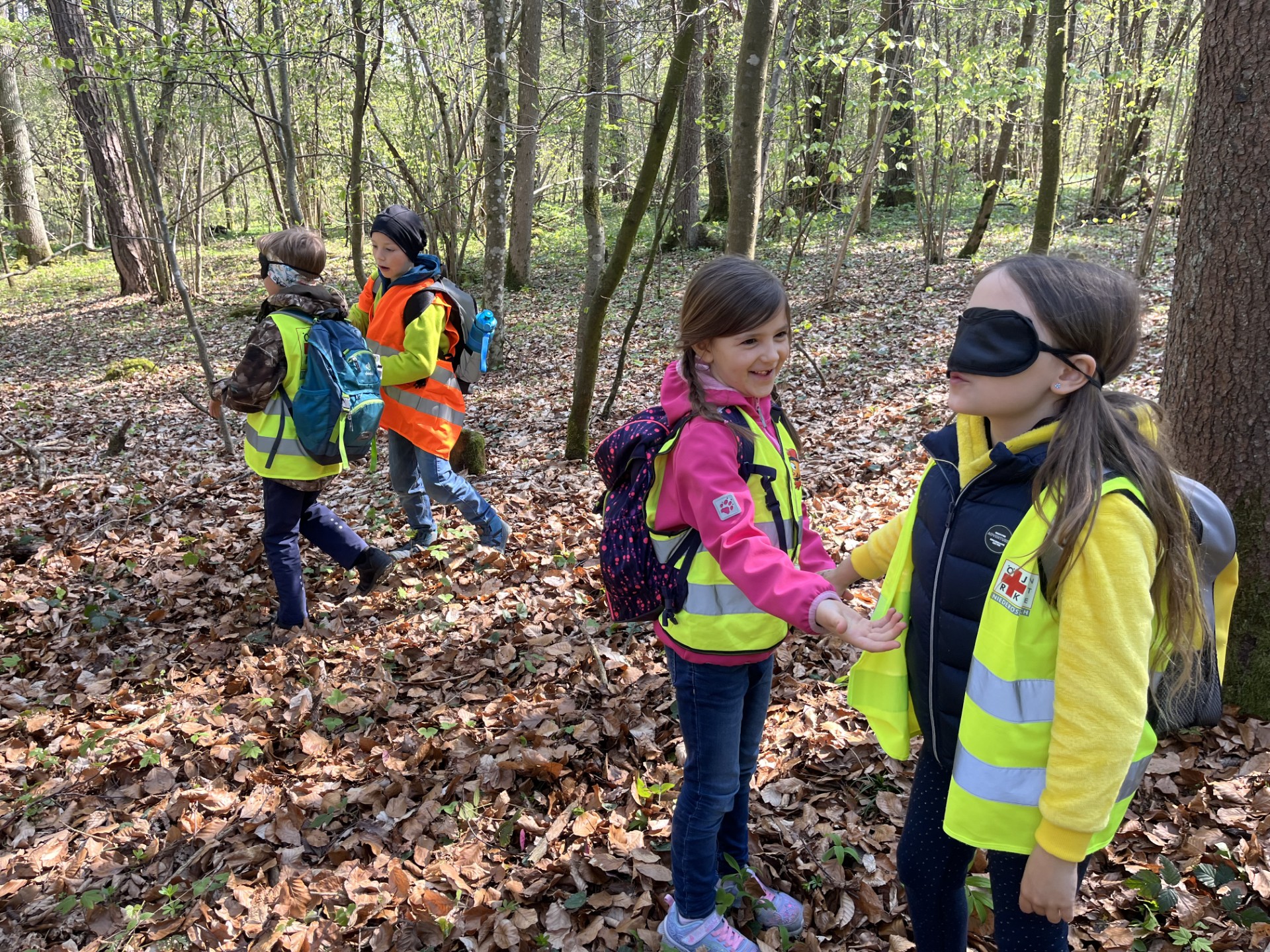 Mit verbundenen Augen wurden von den Kindern auch Bäume ertastet und auf spielerische Weise der Unterschied von Nadel- und Laubbäumen vermittelt.