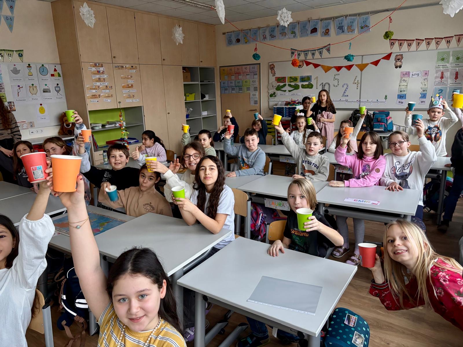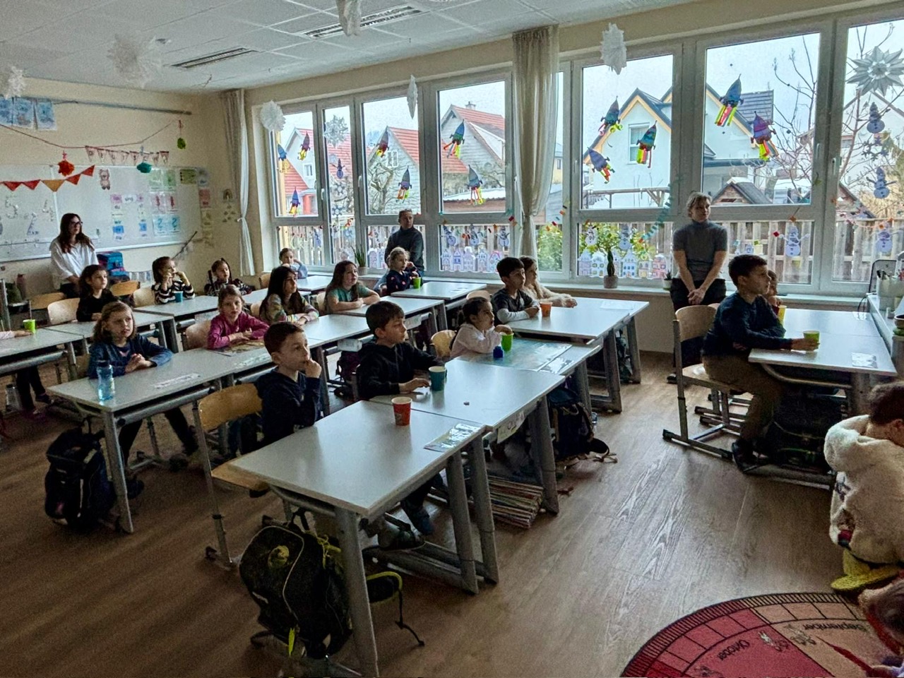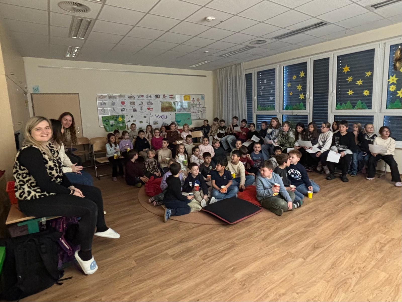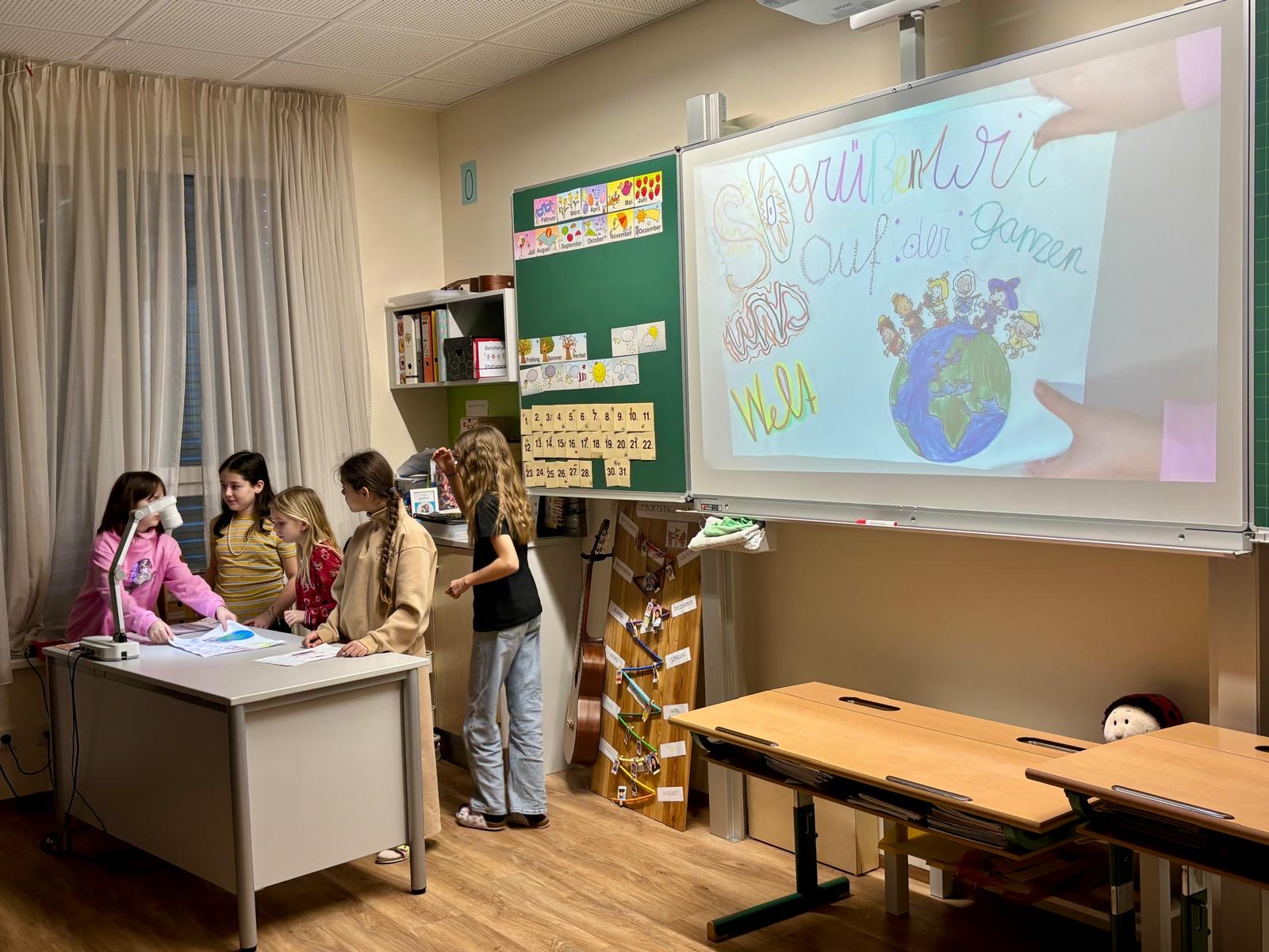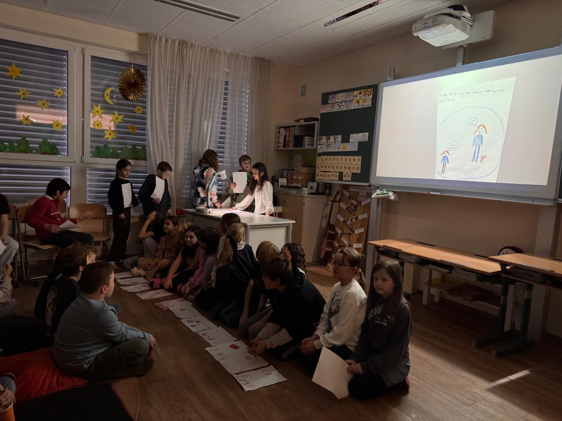 Die 4. Klasse nahm die Zuhörerinnen und Zuhörer mit auf eine sprachliche Reise: Sie zeigte, wie man in verschiedenen Sprachen einfache Begrüßungen, Wörter und Verabschiedungen sagt. Passende Bilder wurden präsentiert und das Publikum aktiv eingebunden – alle durften mitsprechen und mitmachen.