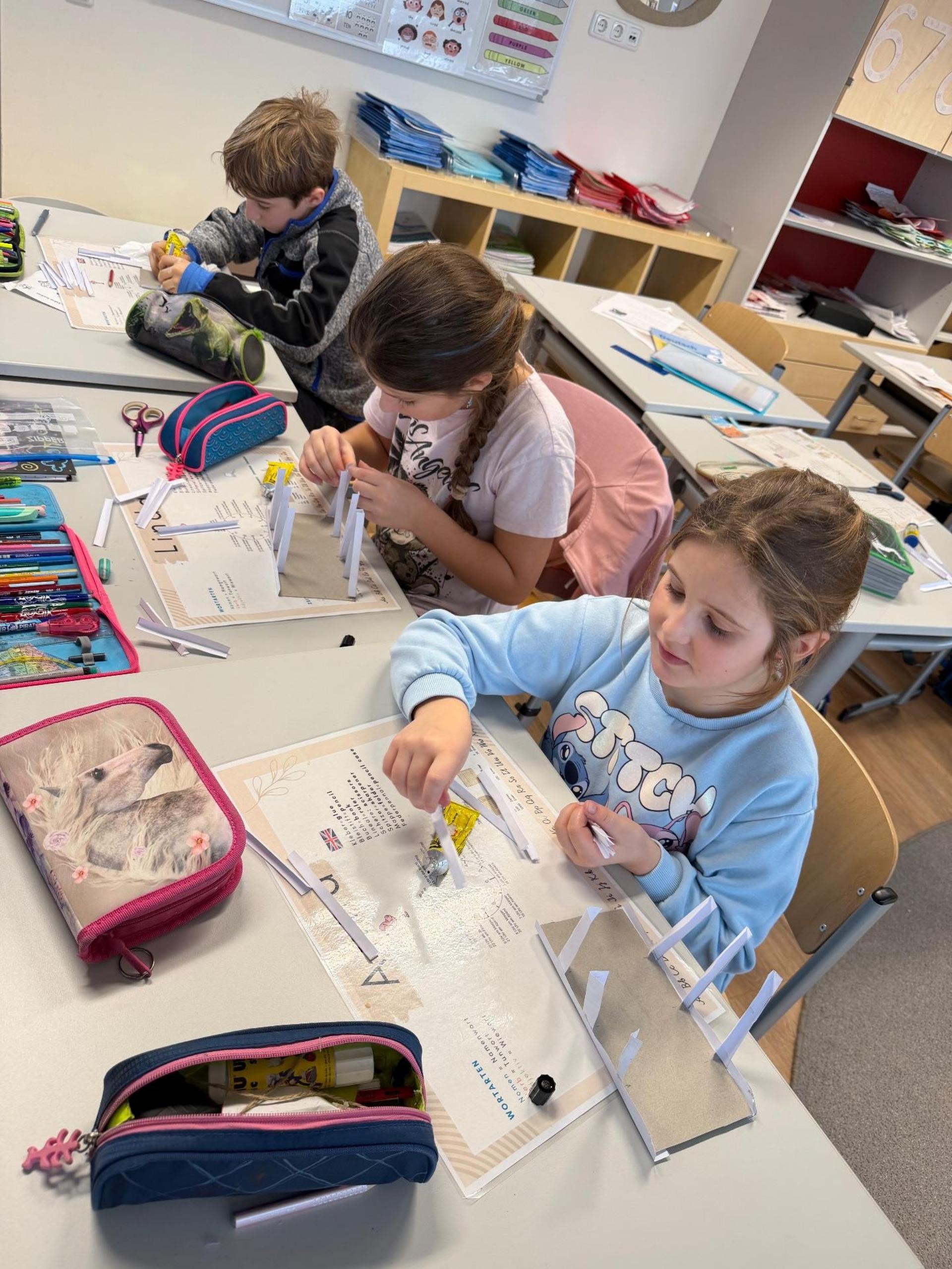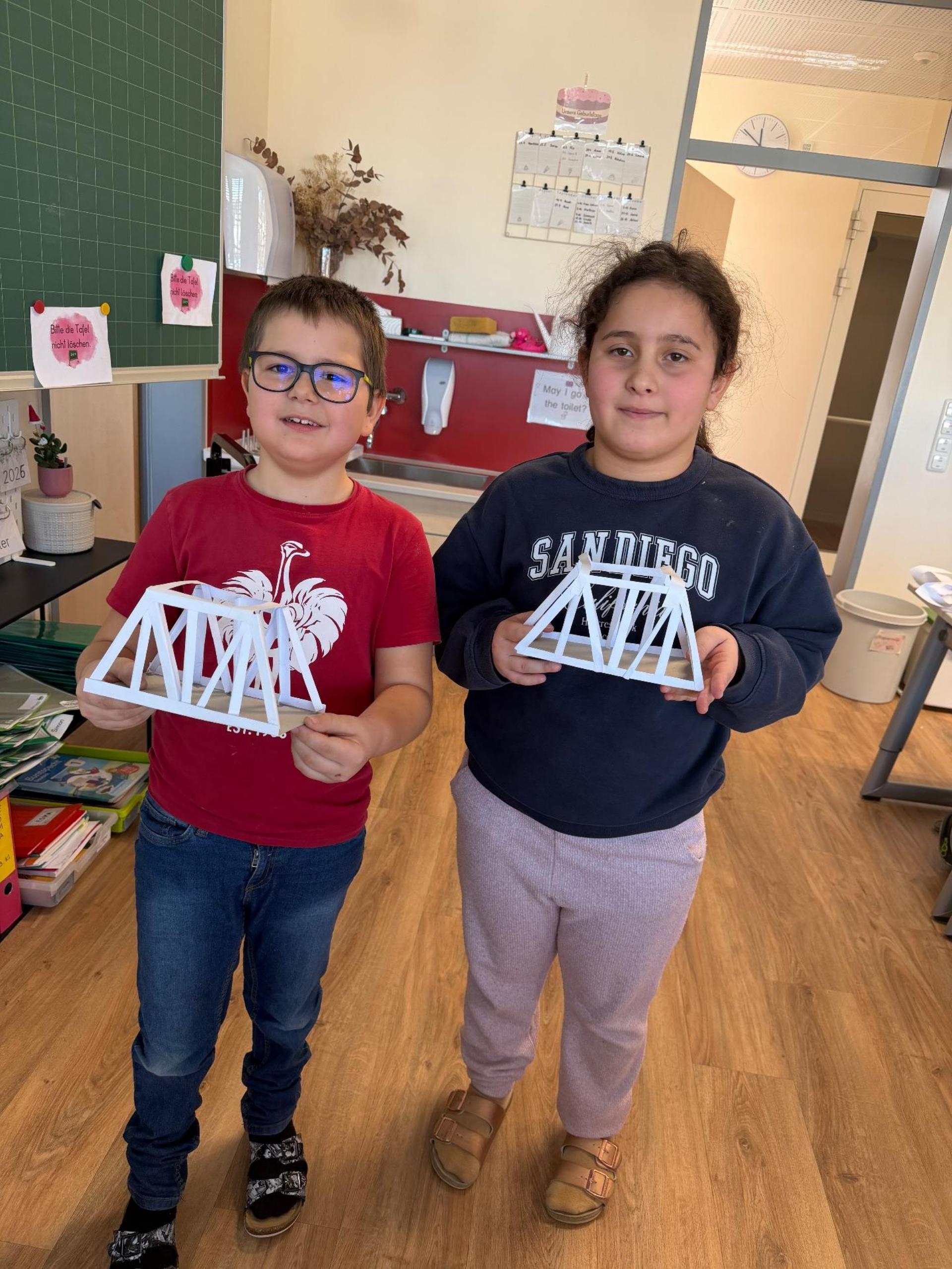 Ein besonderes Highlight war der Bau einer eigenen Fachwerkbrücke. Mit viel Konzentration und Geschick wurde genau gemessen, gefaltet und zusammengesetzt. Dabei stellten die Kinder fest, wie wichtig präzises Arbeiten ist, damit eine Brücke am Ende stabil stehen kann.