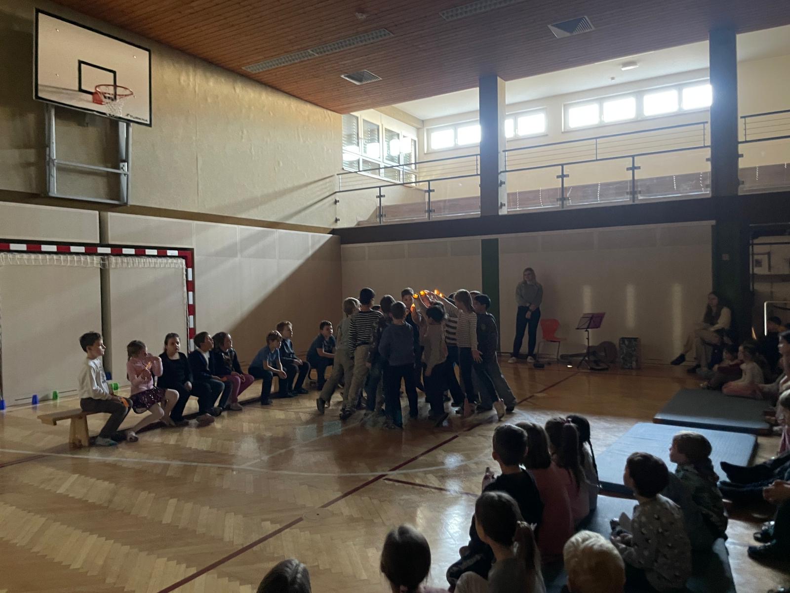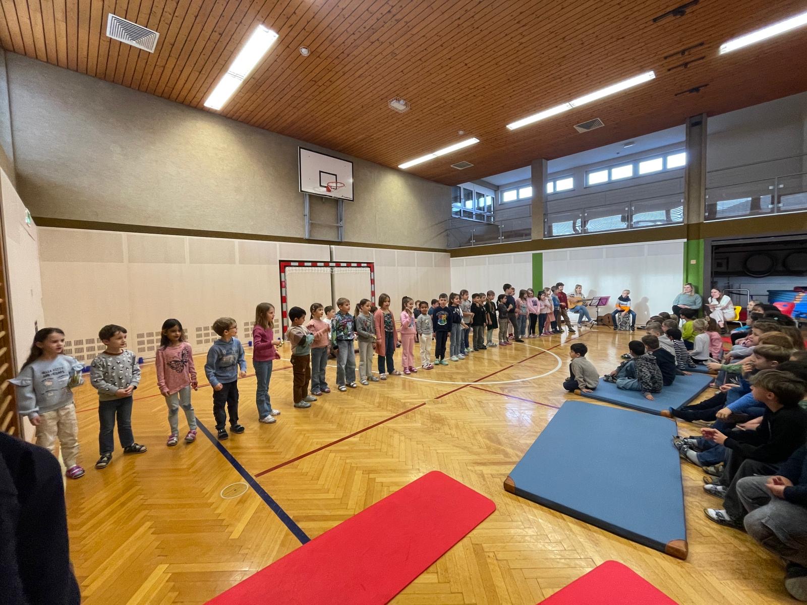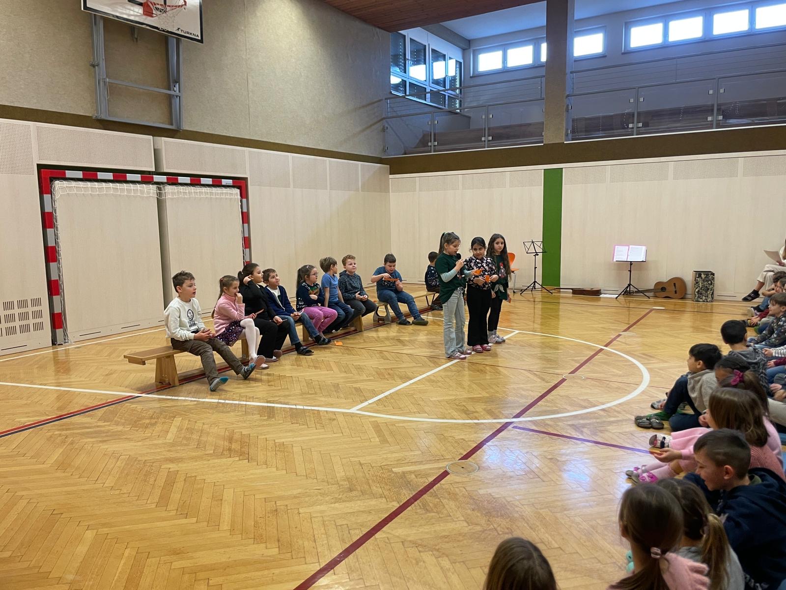 Bei der Schulversammlung am 16.12. begrüßte die 2b Klasse alle Kinder und Lehrer:innen und führte durch das Programm. Zu Beginn wünschten einige Kinder der 2b in ihren jeweiligen Sprachen einen guten Morgen – auf Englisch, Ungarisch und Russisch.