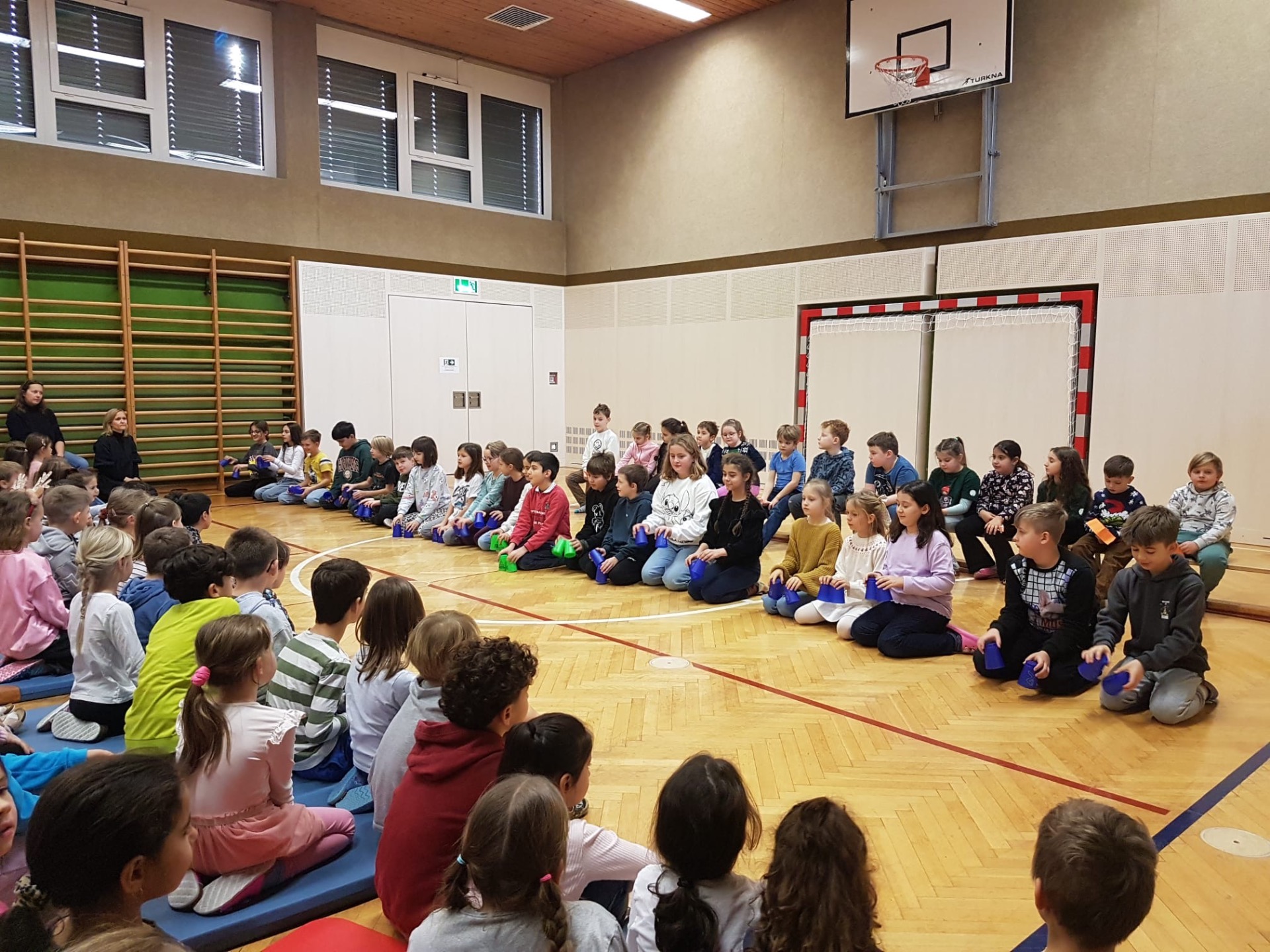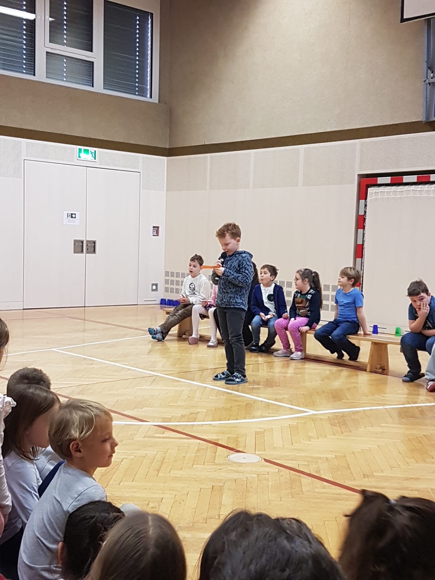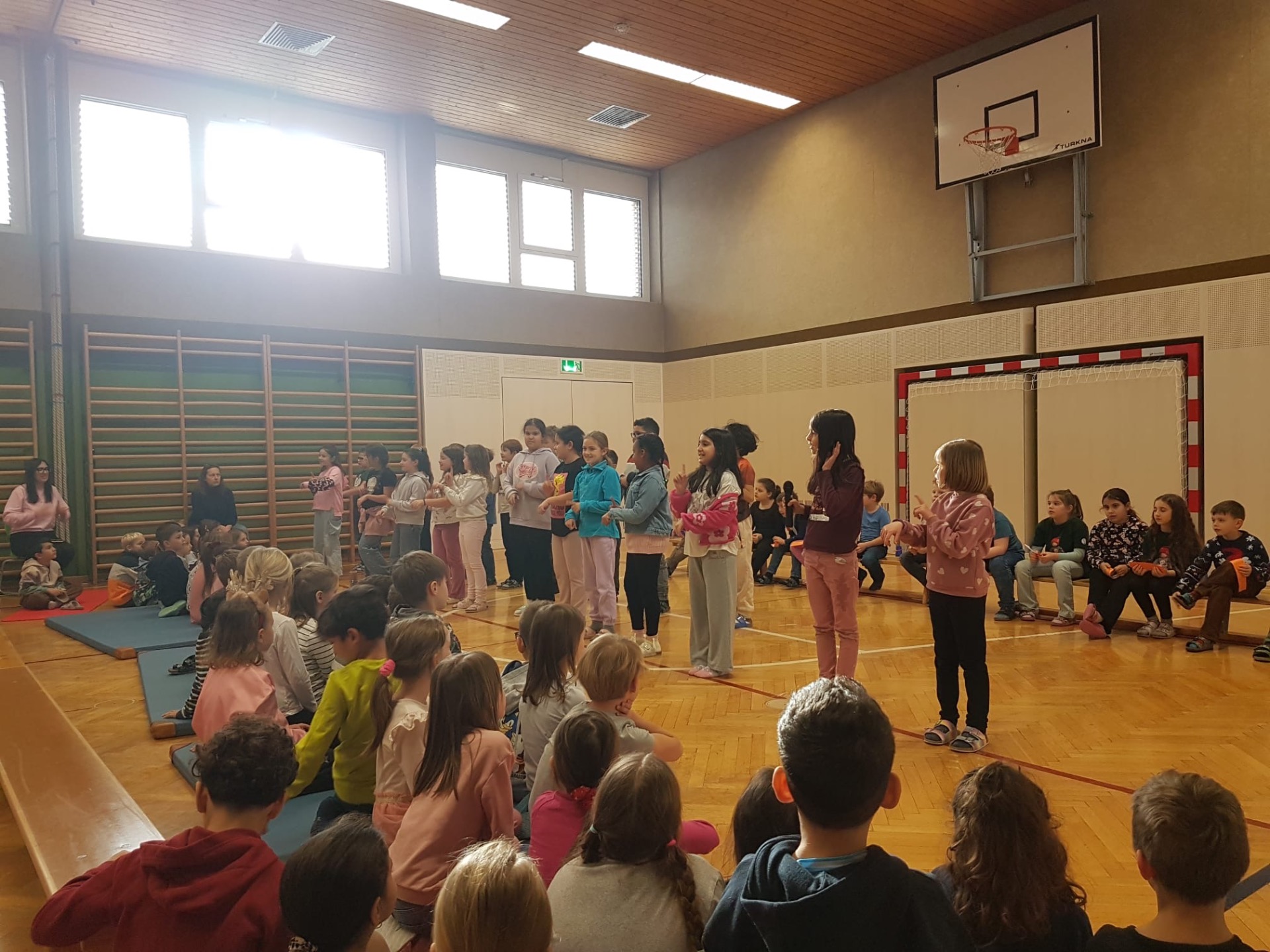 Bei der Schulversammlung am 16.12. begrüßte die 2b Klasse alle Kinder und Lehrer:innen und führte durch das Programm. Zu Beginn wünschten einige Kinder der 2b in ihren jeweiligen Sprachen einen guten Morgen – auf Englisch, Ungarisch und Russisch.