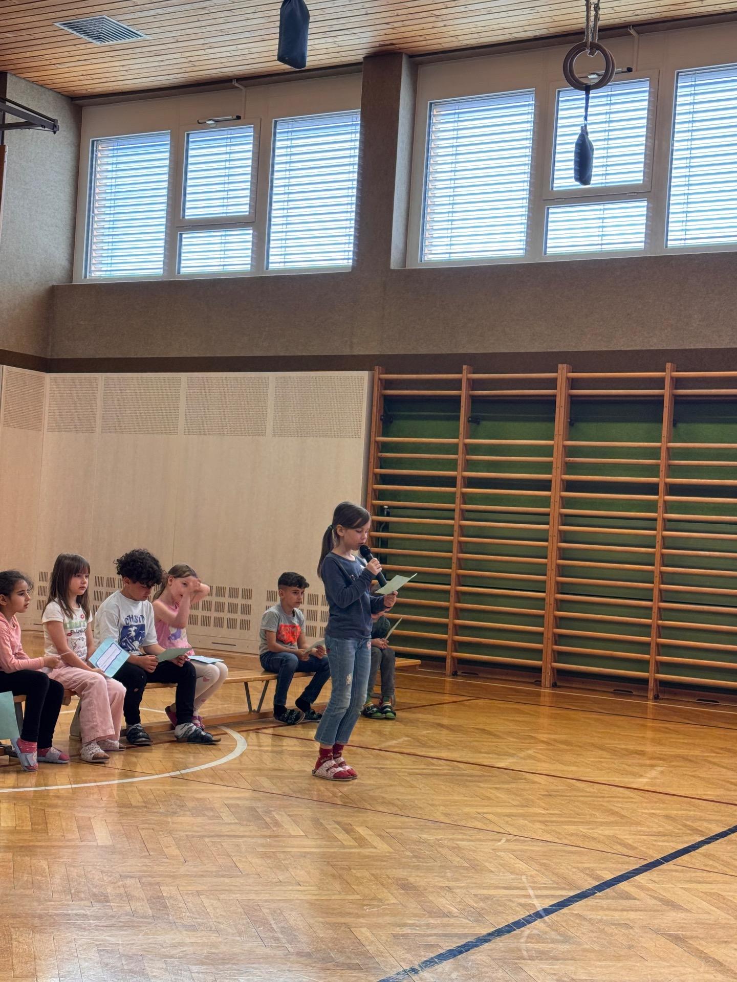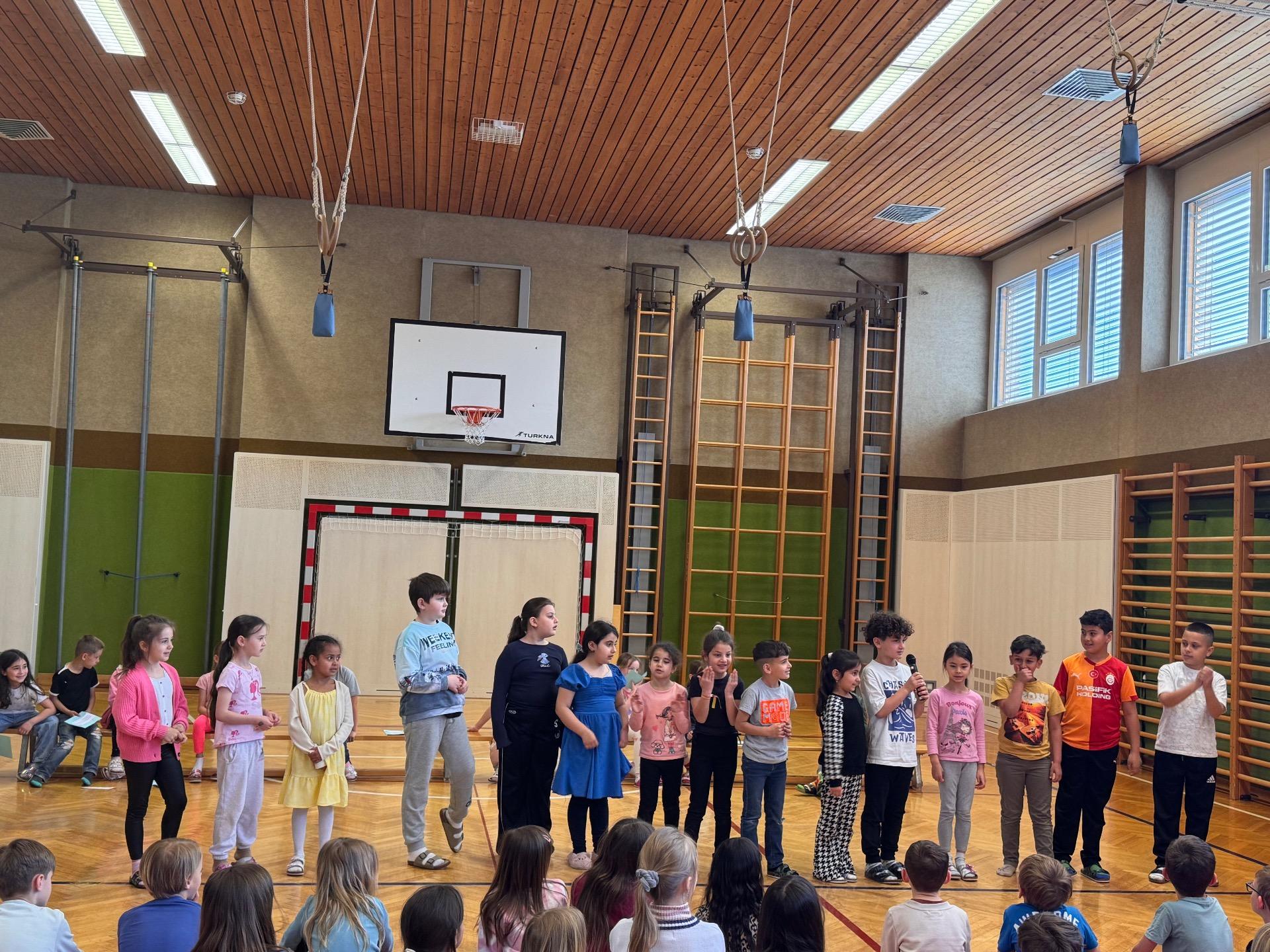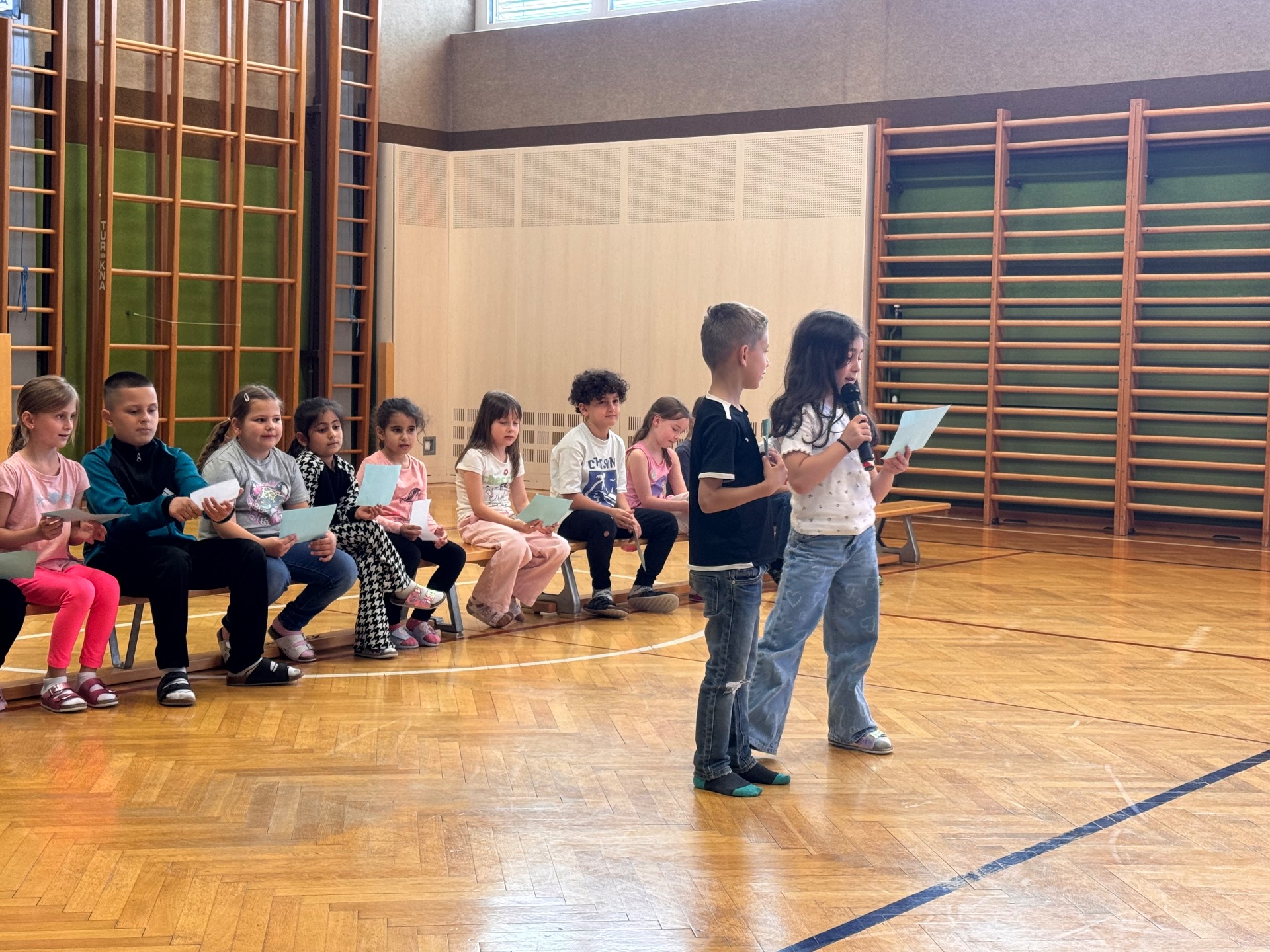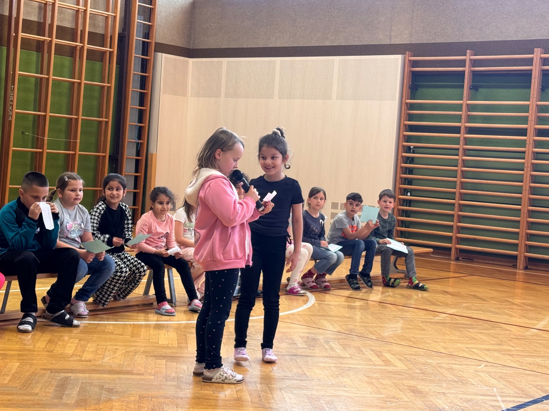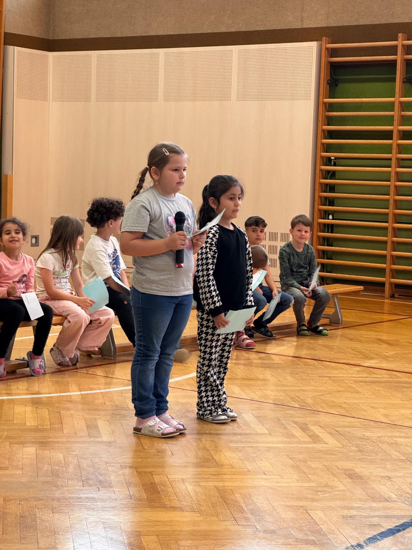 Am Montag, den 27. April 2026, durften die Kinder der 1a-Mäuseklasse die Moderation der Schulversammlung im April übernehmen. Die Kinder hatten vorab ihre Texte fleißig geübt und waren mutig genug, um vor allen Kindern in ein Mikrophon zu sprechen. Trotz Nervosität haben alle Kinder ihren Soloauftritt bravourös gemeistert und waren hinterher sehr stolz auf ihre Leistung.
