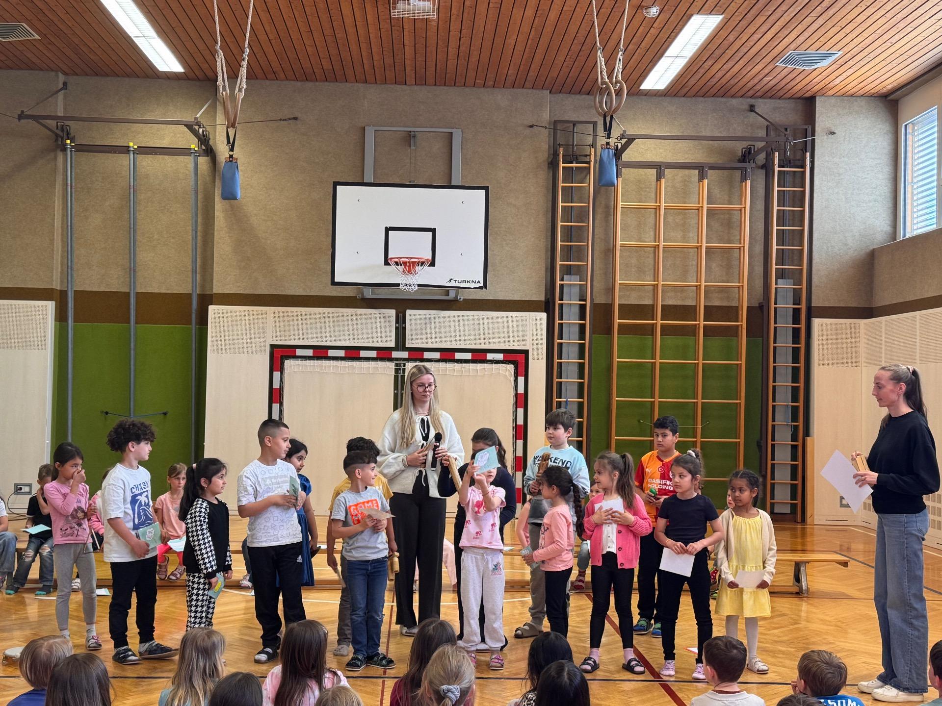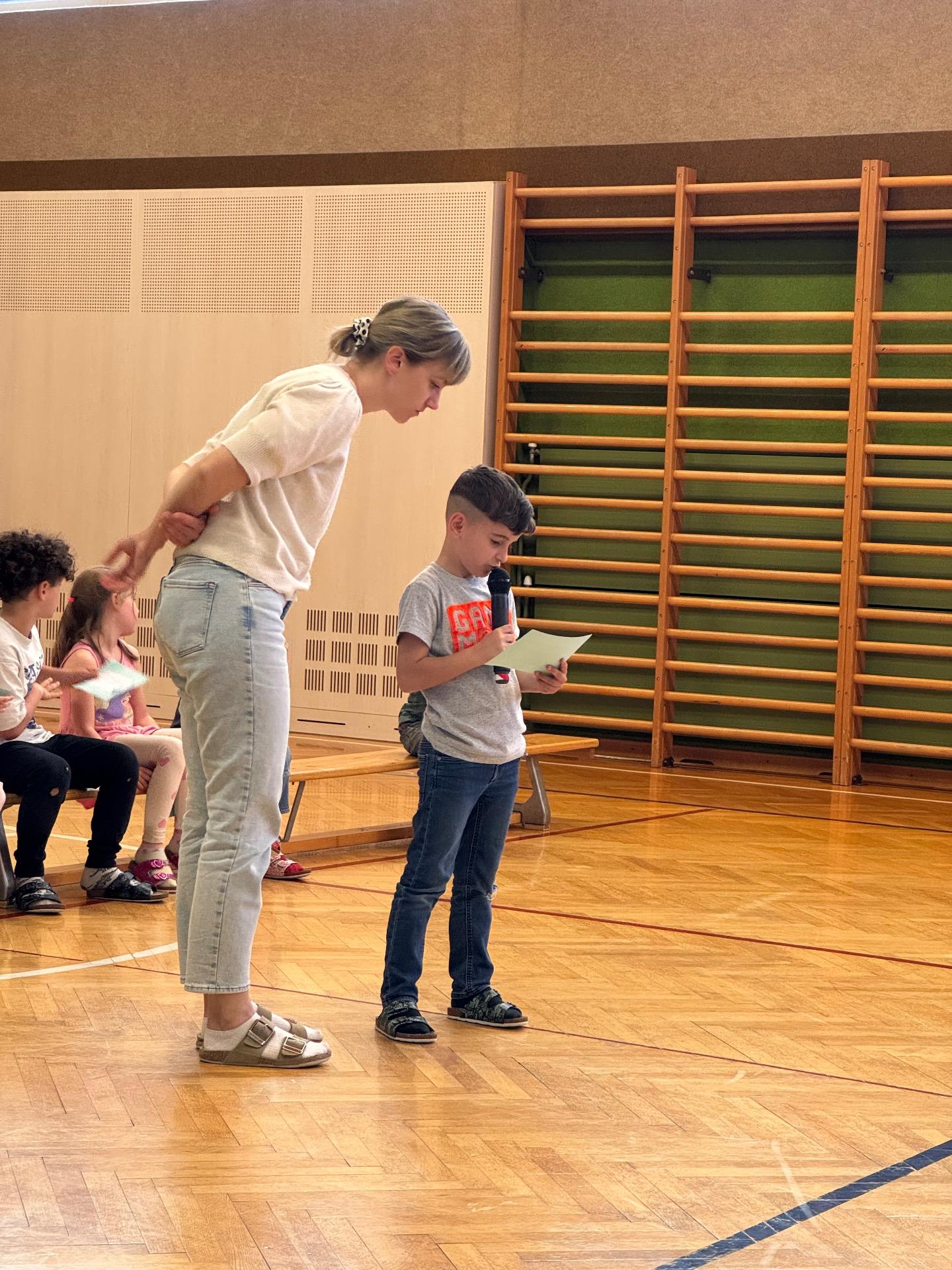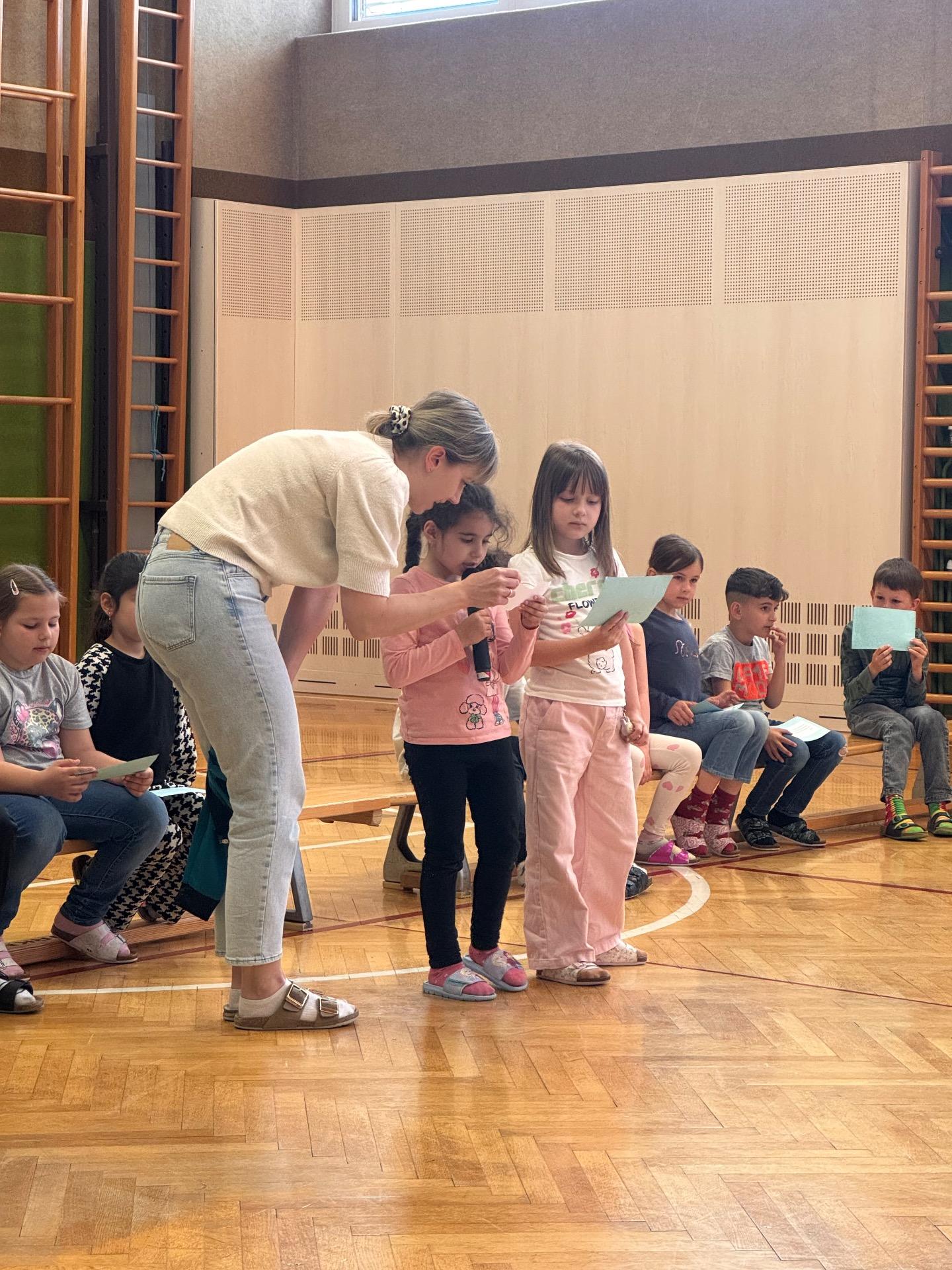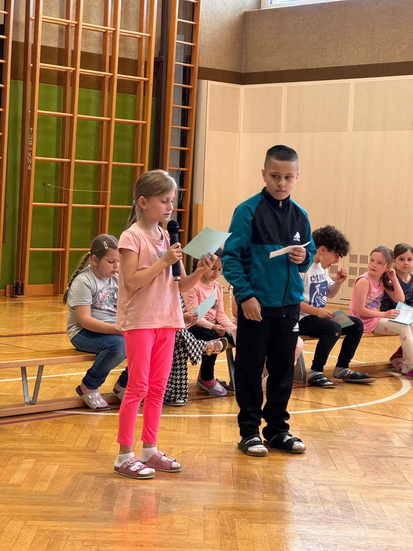 Am Montag, den 27. April 2026, durften die Kinder der 1a-Mäuseklasse die Moderation der Schulversammlung im April übernehmen. Die Kinder hatten vorab ihre Texte fleißig geübt und waren mutig genug, um vor allen Kindern in ein Mikrophon zu sprechen. Trotz Nervosität haben alle Kinder ihren Soloauftritt bravourös gemeistert und waren hinterher sehr stolz auf ihre Leistung.