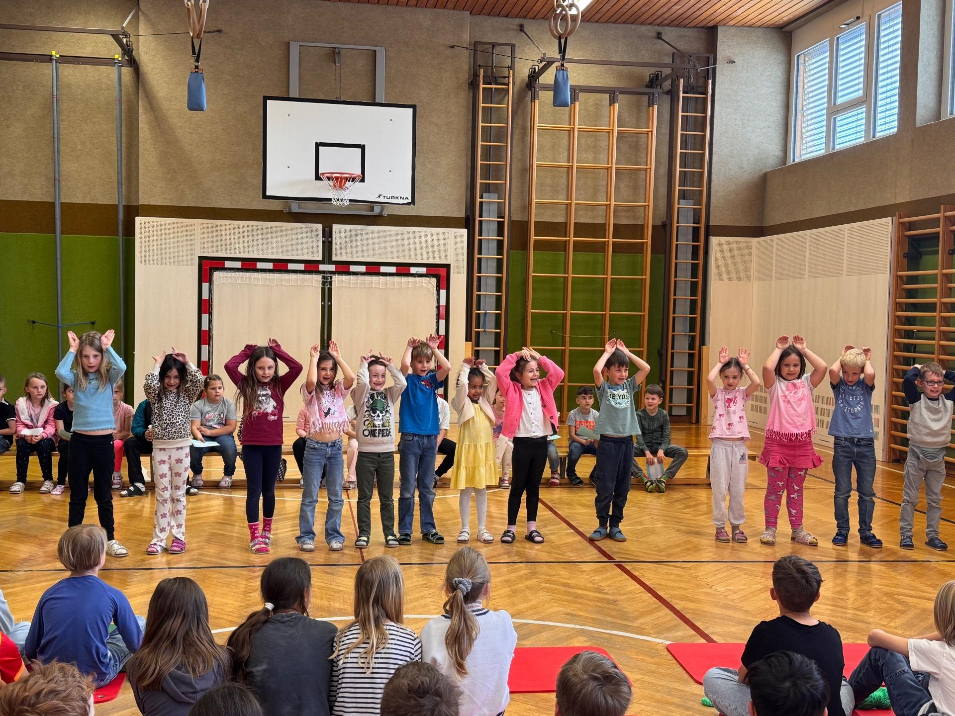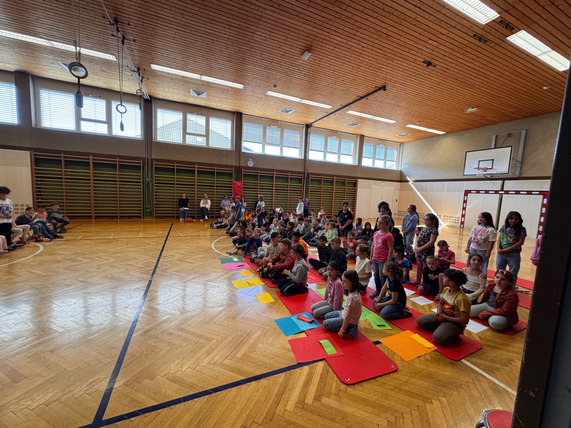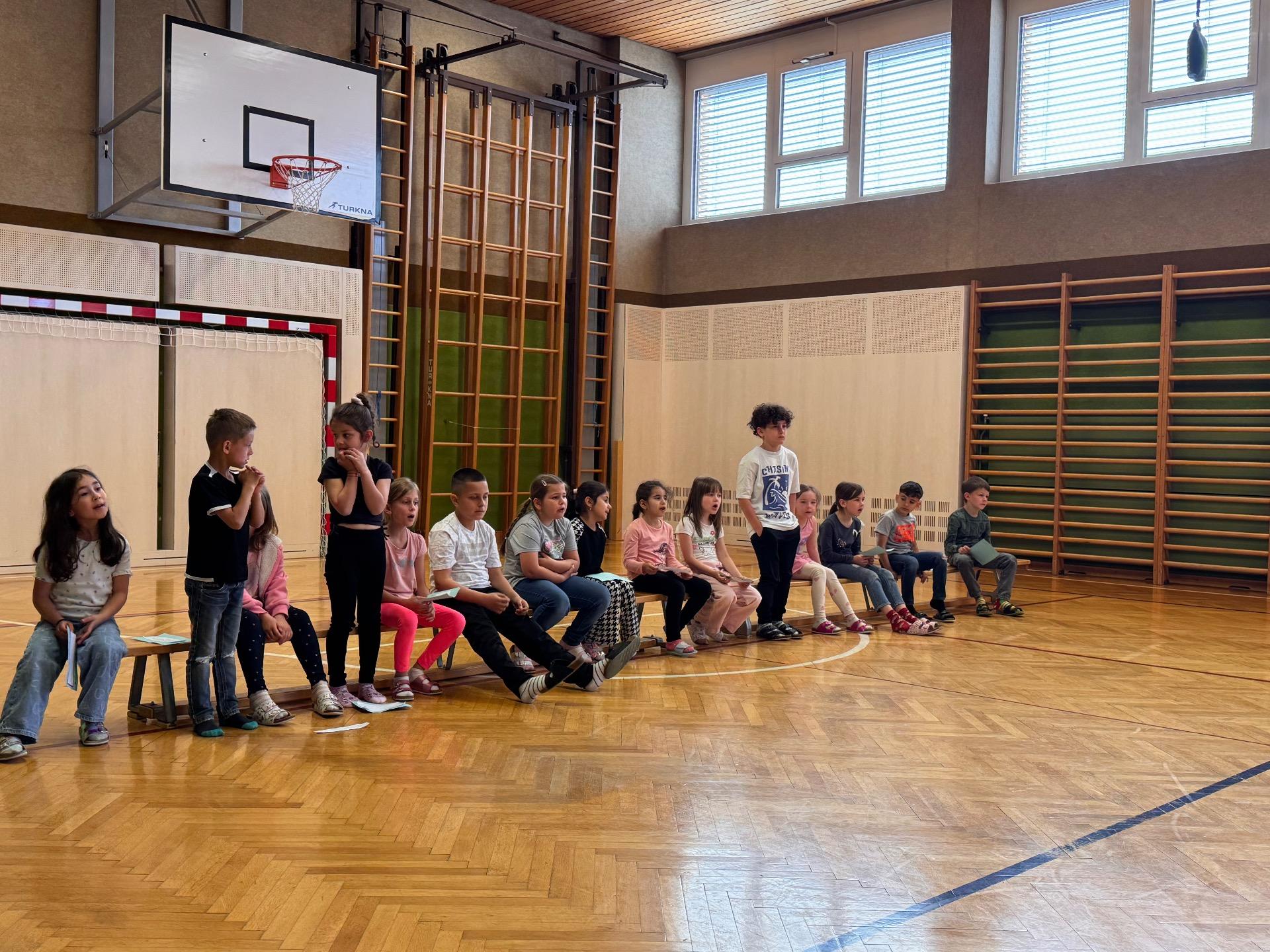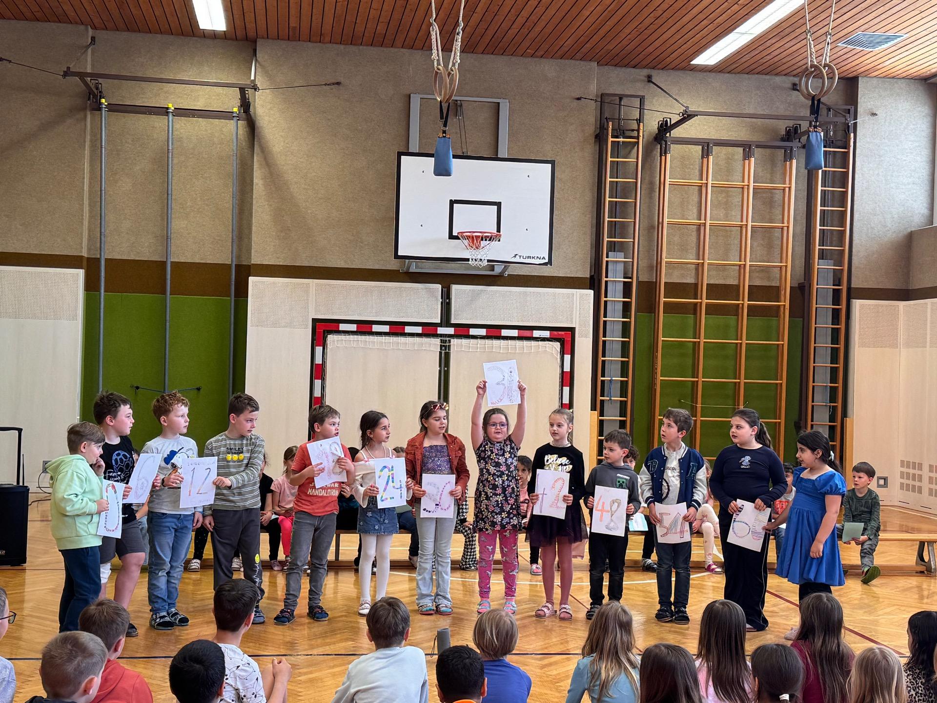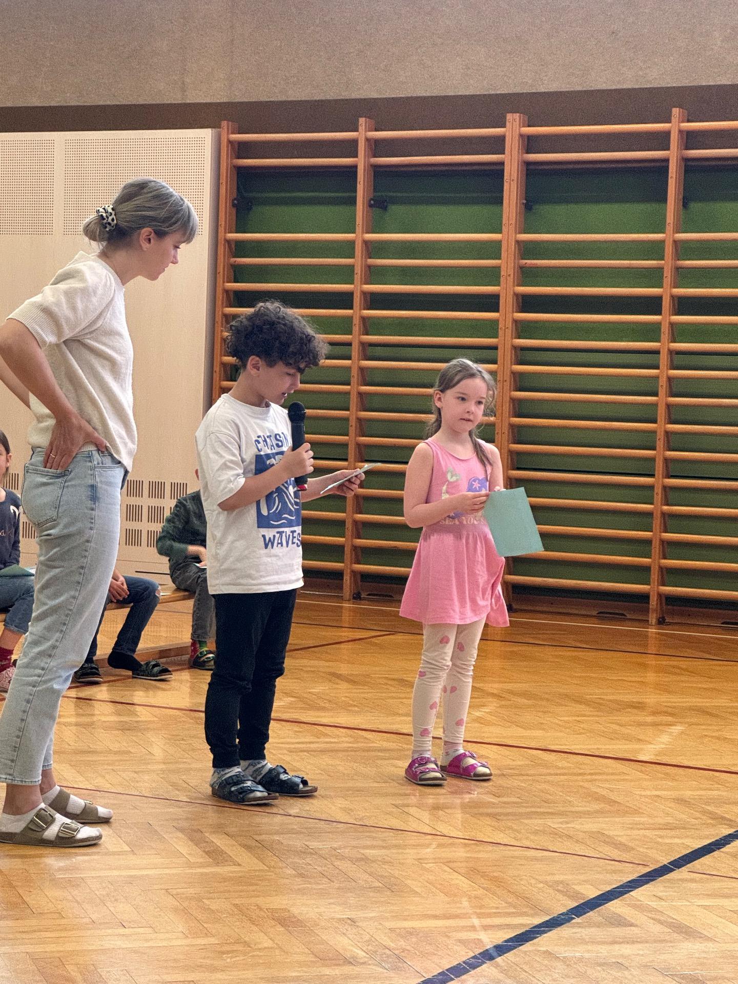 Am Montag, den 27. April 2026, durften die Kinder der 1a-Mäuseklasse die Moderation der Schulversammlung im April übernehmen. Die Kinder hatten vorab ihre Texte fleißig geübt und waren mutig genug, um vor allen Kindern in ein Mikrophon zu sprechen. Trotz Nervosität haben alle Kinder ihren Soloauftritt bravourös gemeistert und waren hinterher sehr stolz auf ihre Leistung.