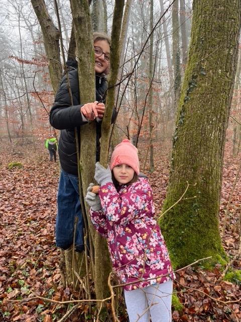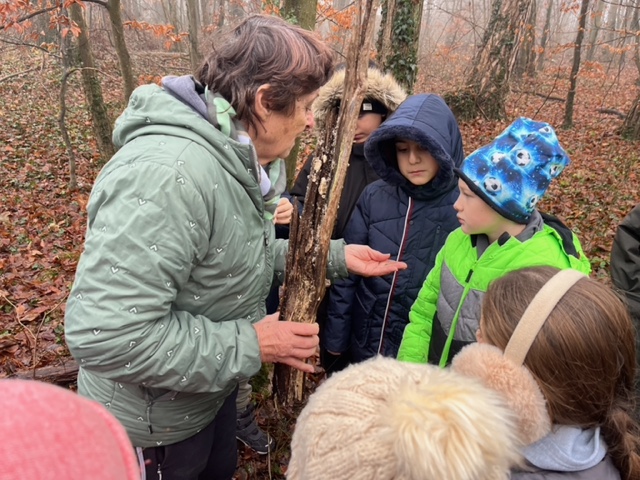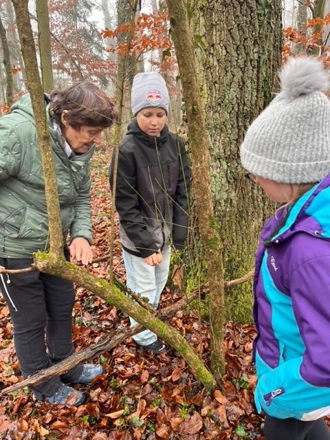 Gleich zu Beginn entdeckten wir ein Spechtloch. Das nahm Elfriede zum Anlass, mit den Kindern über verschiedene Spechtarten und ihre Lebensweise zu sprechen. Danach ging das Staunen weiter: Die Kinder fanden eine kleine Tanne, an der erklärt wurde, wie man das Alter von Bäumen erkennen kann – bei großen Bäumen an den Jahresringen und bei jungen Bäumen an den Knubbeln an der Außenseite. Auch der Unterschied zwischen Fichte und Tanne wurde anschaulich besprochen.